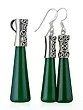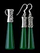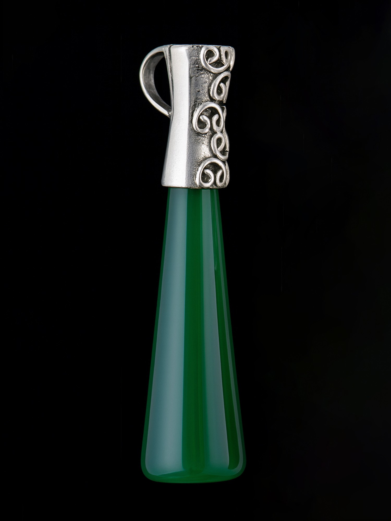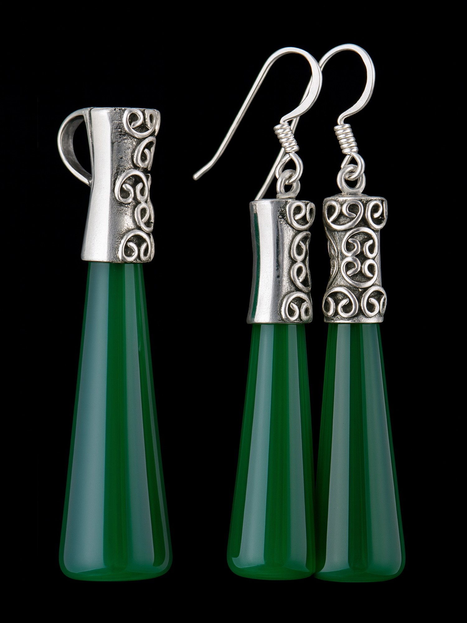 Each piece in this set is meticulously designed to highlight the natural allure of the green onyx. The gemstones are cut into a distinctive tapered "pencil" shape, creating a sleek and modern silhouette. This unique form is further enhanced by the intricately detailed sterling silver caps. These caps are adorned with a repeating scrollwork motif, adding a touch of vintage sophistication and delicate artistry. The contrast between the smooth, polished gemstone and the textured silver creates a visually appealing and luxurious feel. The pendant features a generous bail, allowing it to be easily strung onto your favorite sterling silver chain or cord, instantly transforming your neckline. The matching earrings are designed as graceful drops, suspended from comfortable sterling silver ear wires. The earrings echo the pendant's design, ensuring a cohesive and harmonious look when worn together.