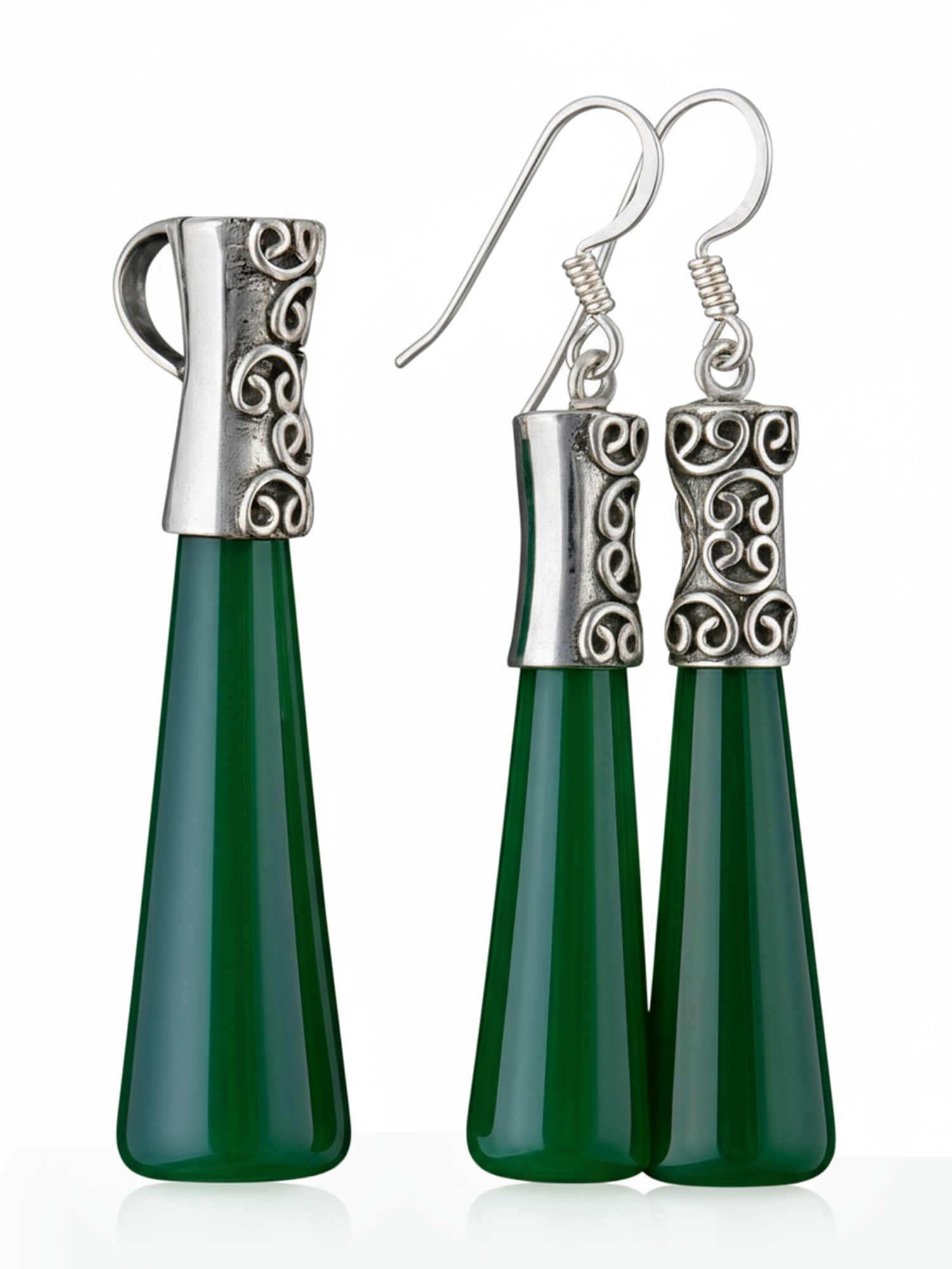 Discover a timeless elegance with this exquisite jewelry set, featuring a striking pendant and a pair of matching drop earrings. Crafted from genuine sterling silver, this ensemble showcases a captivating blend of natural beauty and artisanal craftsmanship. The deep, vibrant green of the onyx gemstones draws the eye, evoking a sense of lush nature and sophisticated charm.
