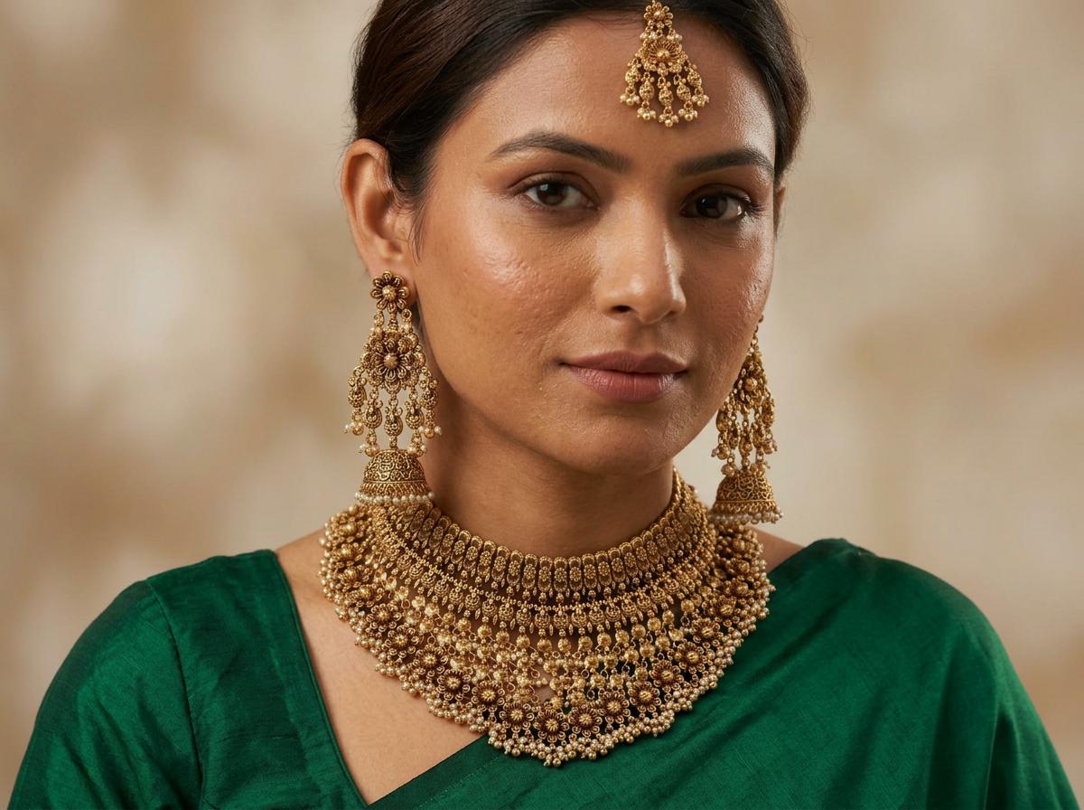 Rajwadi Design Choker Necklace Set With Beautiful Carving Earrings And Hanging Beads