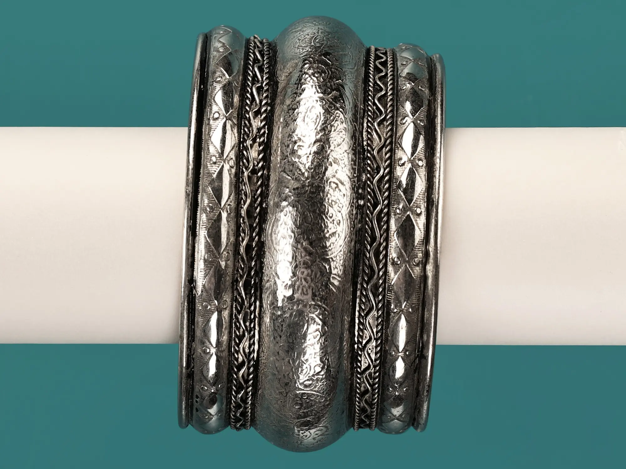 Adorn your wrist with the exquisite artistry of this Tibetan cuff bracelet. Crafted from high-quality white metal, this bracelet is more than just an accessory; it's a statement piece that reflects a rich cultural heritage and impeccable style. The intricate detailing and unique design make it a captivating addition to any outfit, effortlessly elevating your look from casual to chic. Its sturdy construction ensures lasting durability, allowing you to enjoy its beauty for years to come. The bracelet's versatile design complements a range of styles, from bohemian to modern, making it a perfect choice for any fashion-conscious individual.