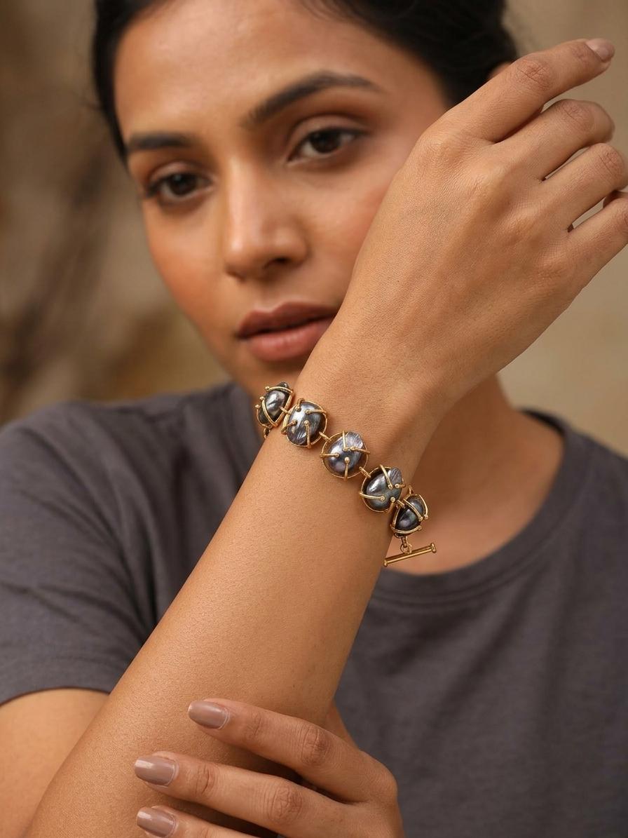 Adorn your wrist with an accessory that whispers tales of oceanic depths and celestial twilight. You'll experience the captivating allure of stones that shimmer with an iridescent glow, artfully held by a foundation of precious metal. This piece is designed to be a conversation starter, a subtle yet stunning declaration of refined taste.