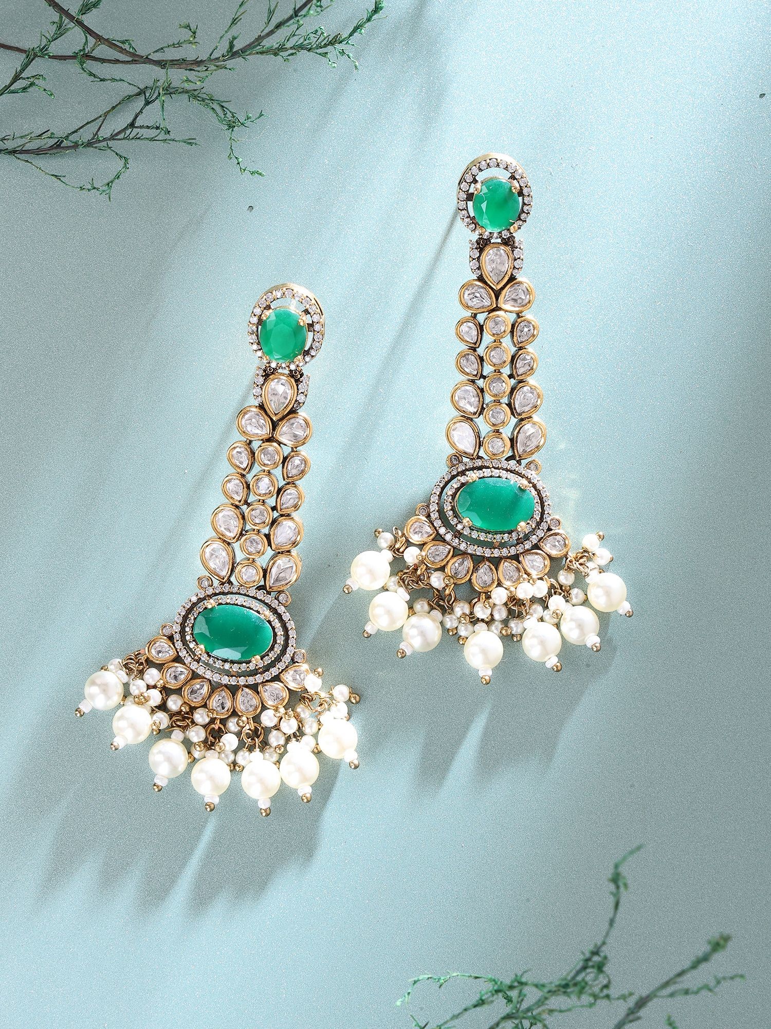 Elegant Kundan Drop Earrings with Pearl and Glass Dangles