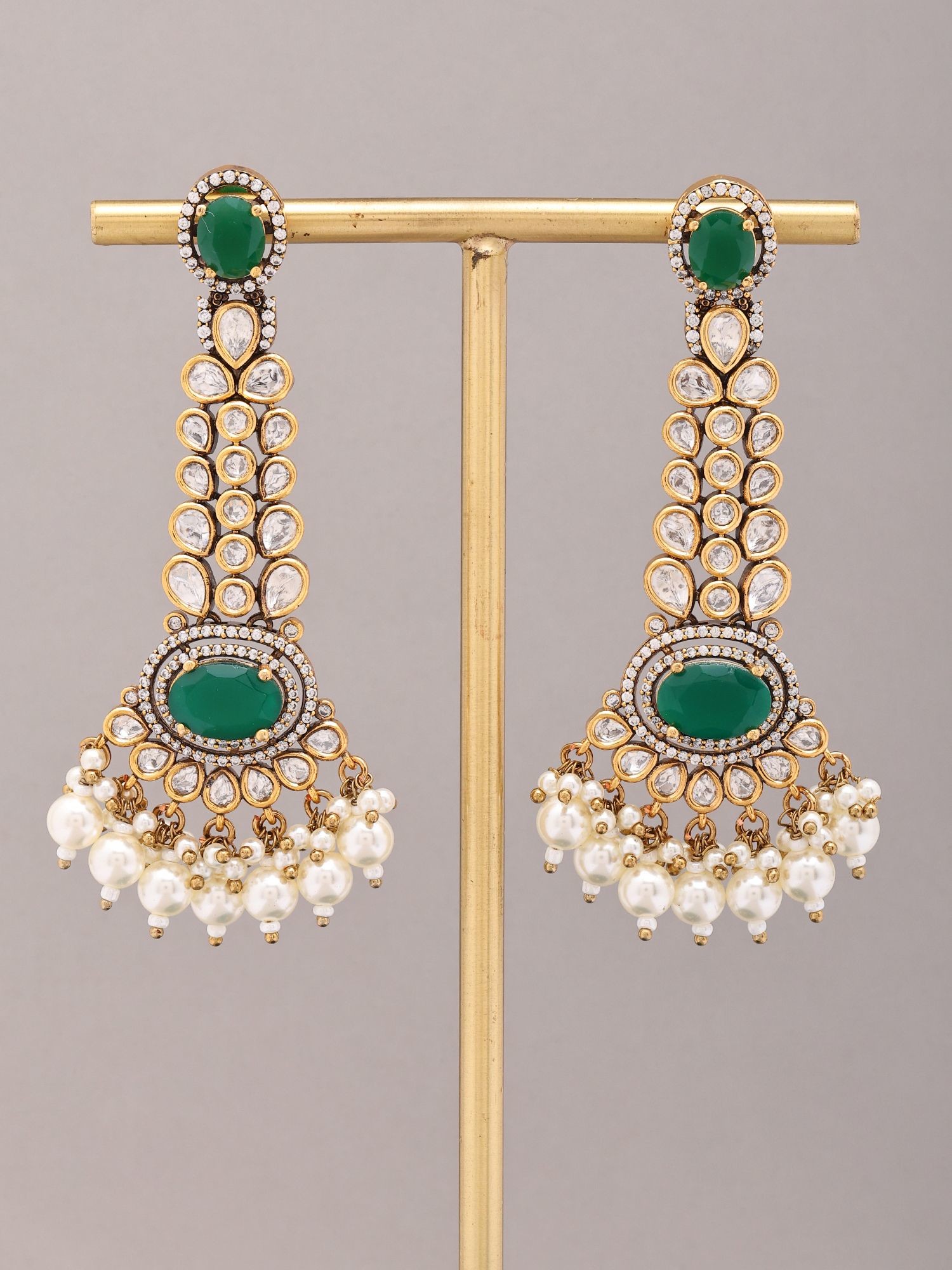 Antique Gold Finish Kundan Chandelier Earrings with Pearl Drops