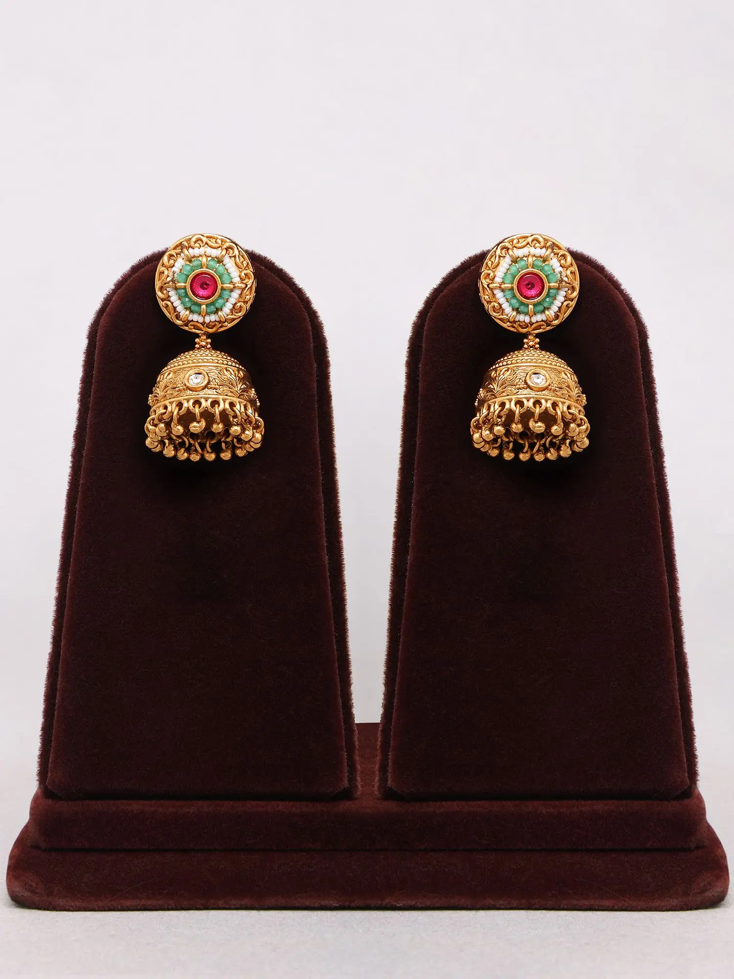 Floral Kundan Earrings with Green Stone and Ghungroo Drops