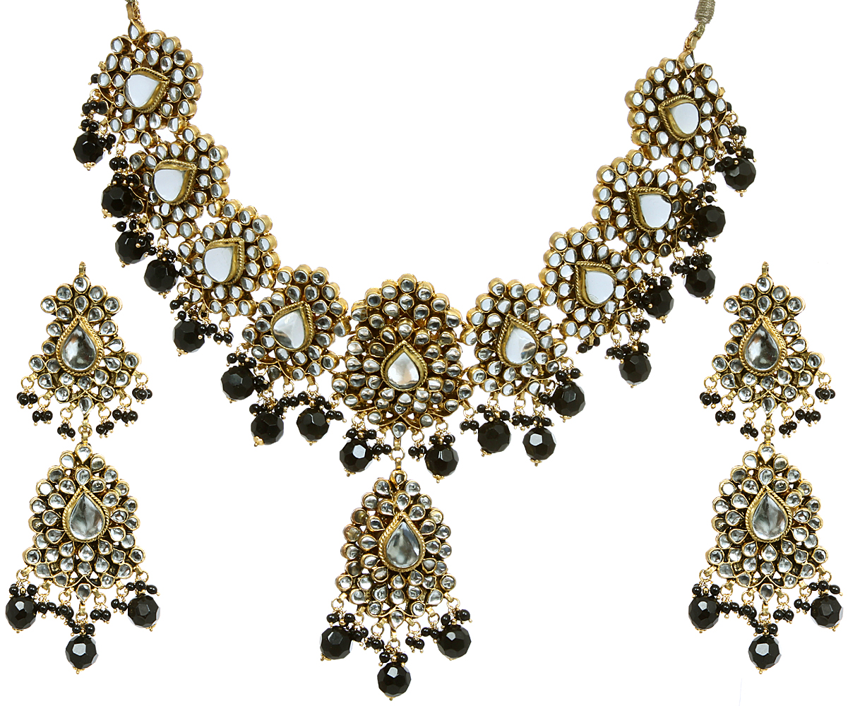 Drawing inspiration from centuries of traditional Indian artistry, this jewelry set embodies the grandeur and mystique of kundan craftsmanship. This technique, revered for its ability to enhance the natural brilliance of gemstones, imbues each piece with an heirloom quality. Owning this set connects you to a rich cultural tapestry, a celebration of beauty that transcends time.