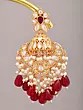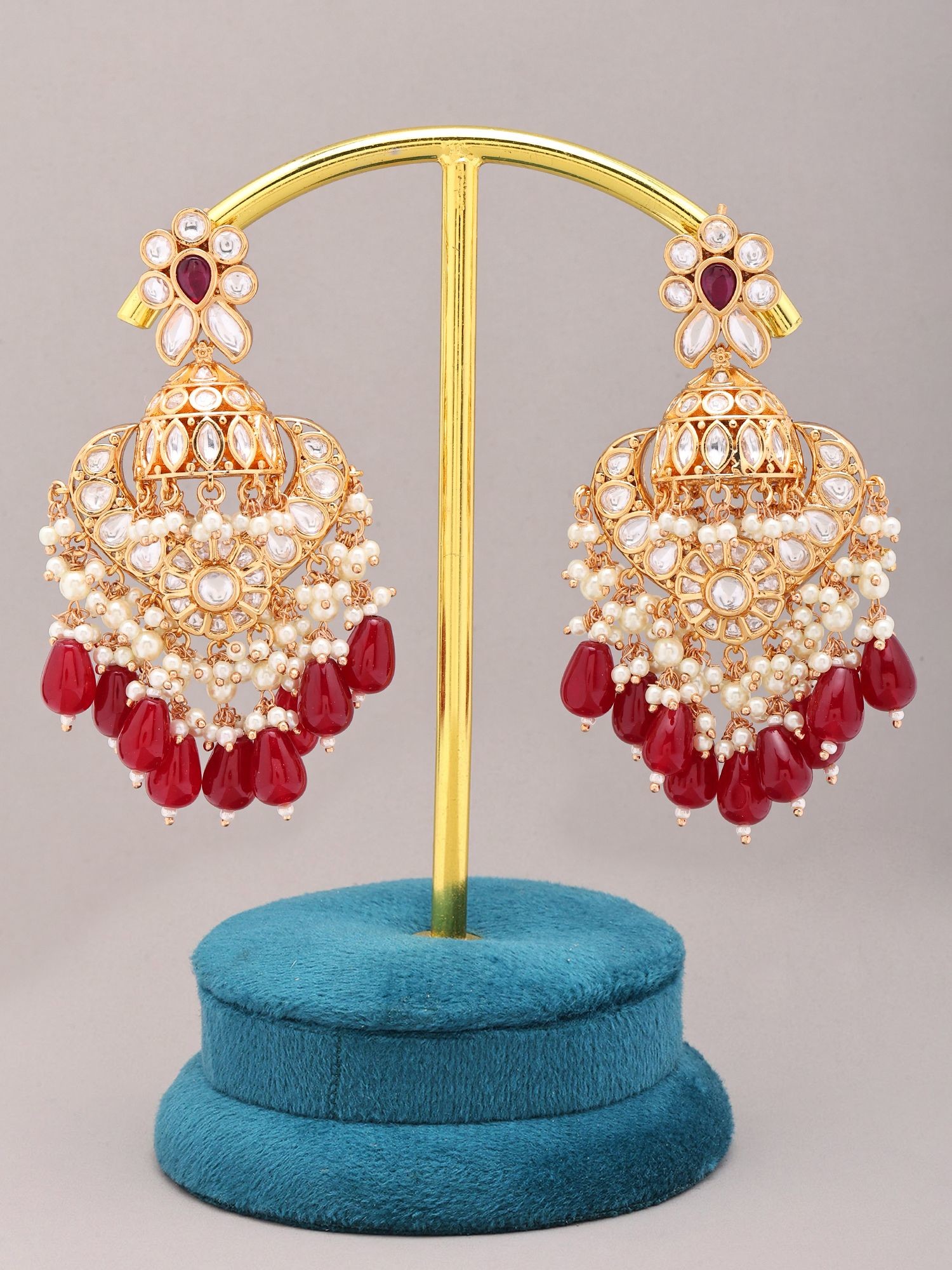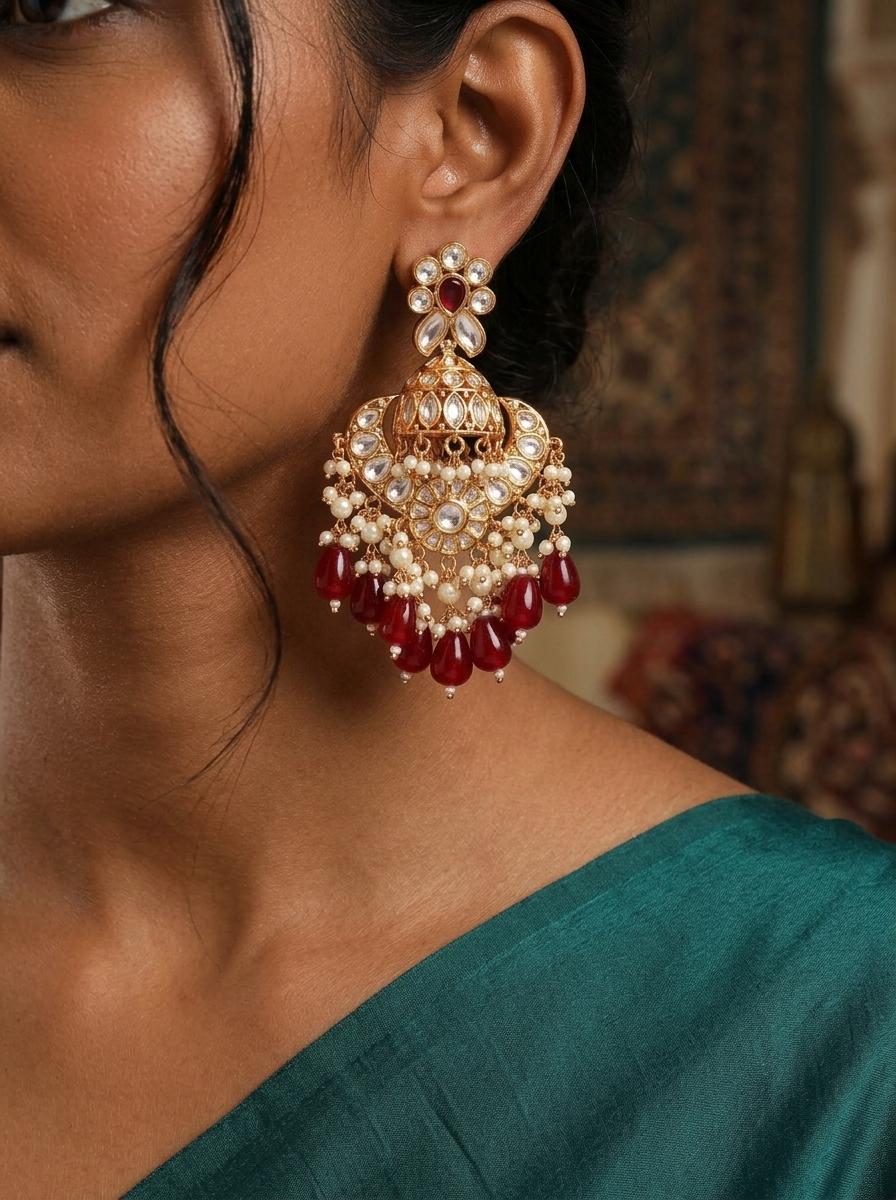 Kundan Chandbali Earrings with Pearl and Red Bead Drops