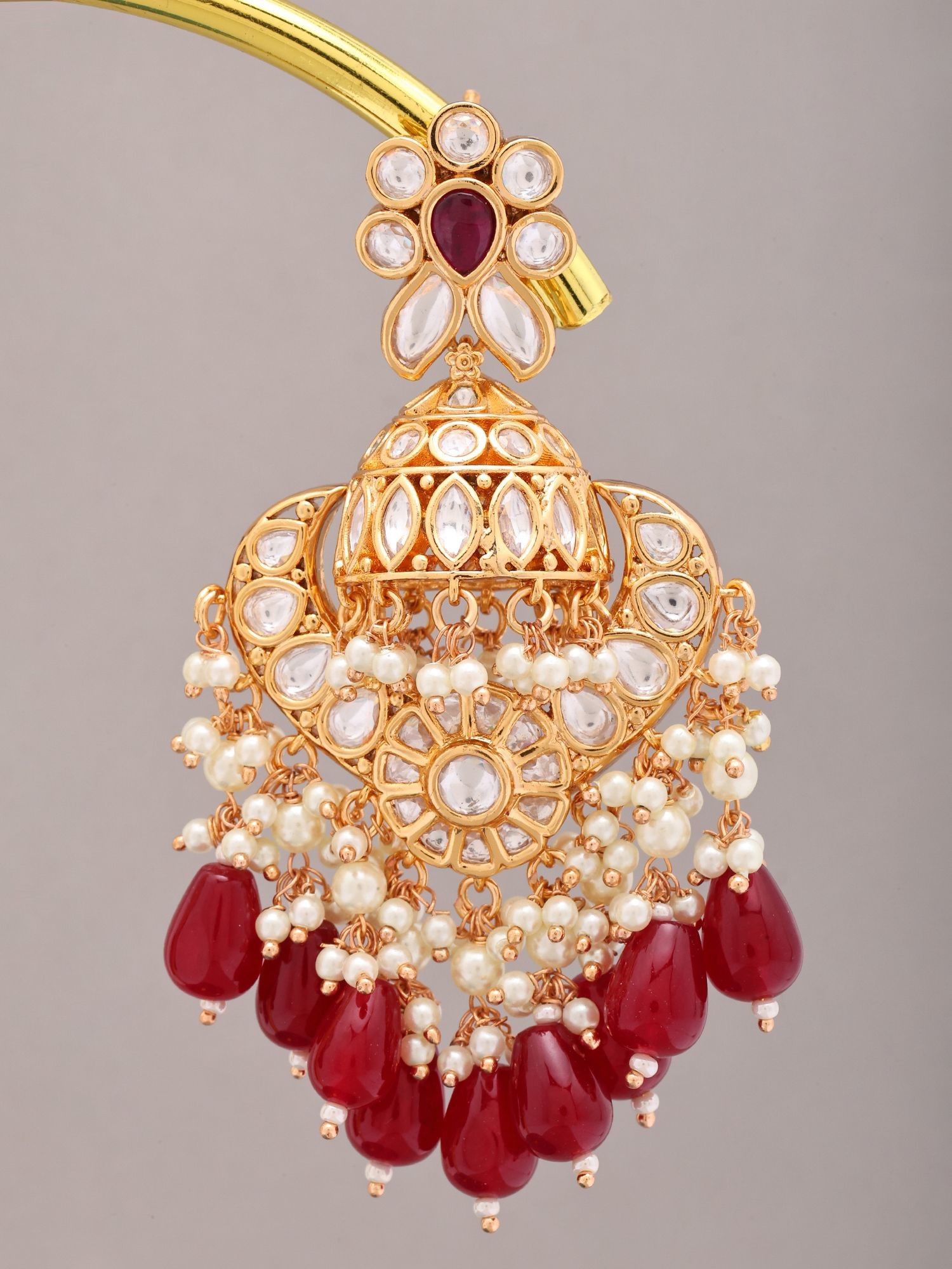 Kundan Jhumka Earrings with Floral Accents and Red Gemstone Drops