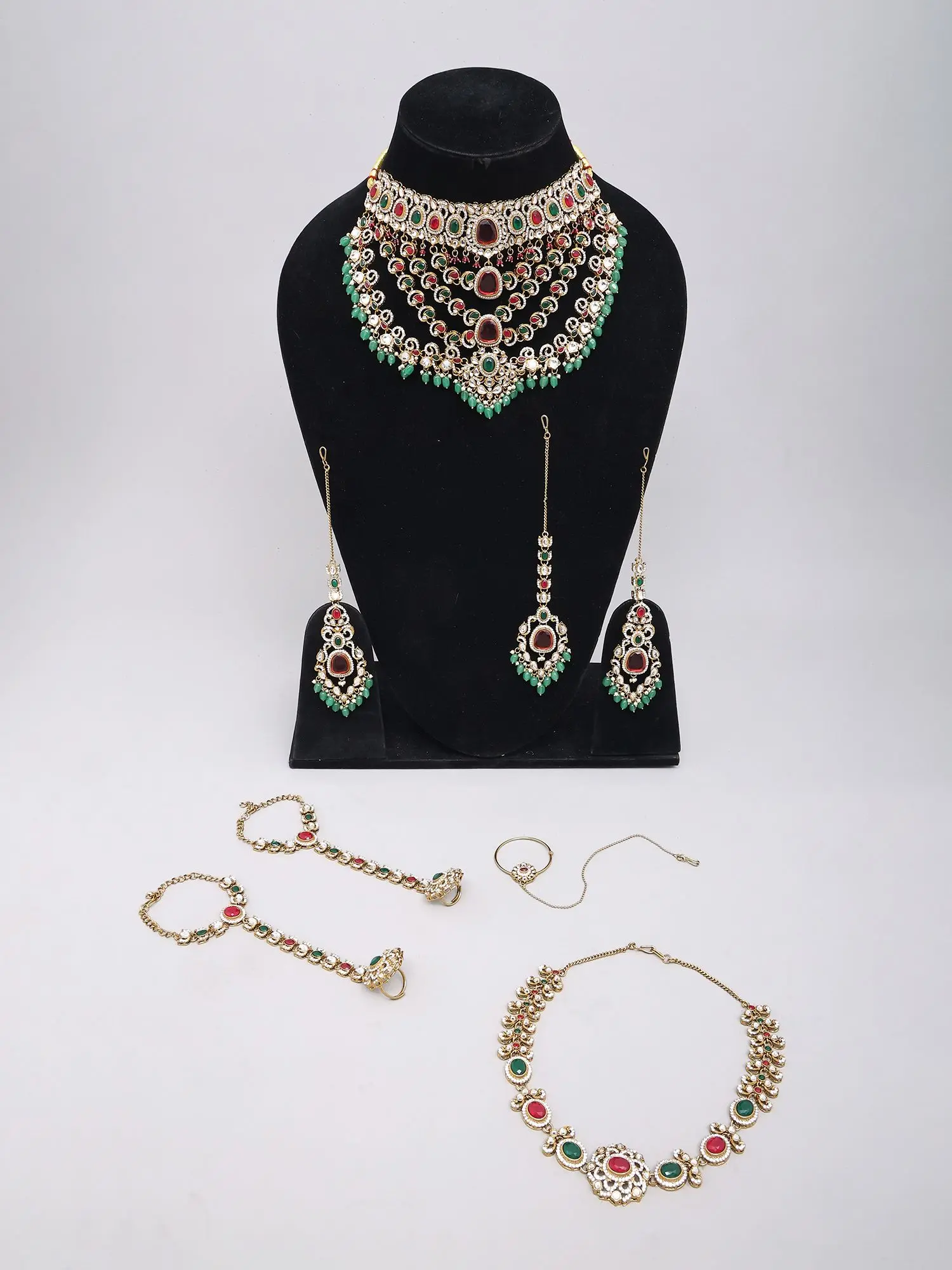 Includes a statement choker, maang tikka, earrings, and haath phool.