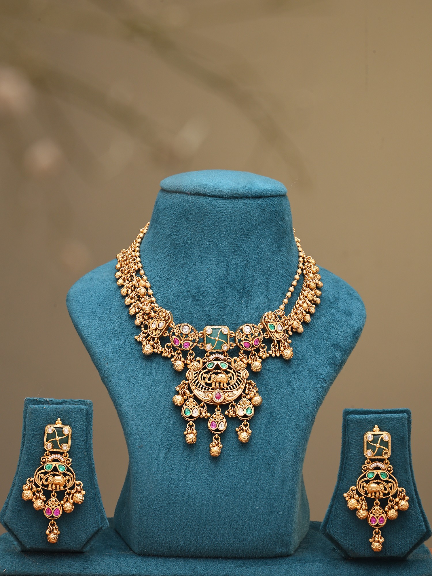 The central motif of this necklace, with its majestic elephant design and vibrant Kundan stones, is a visual delight. Complementing this, the delicate ghungroo drops add a playful yet sophisticated chime, subtly drawing the eye with every movement. The accompanying earrings, mirroring the necklace's artistic vision, possess a refined grace. The necklace itself is designed with a thoughtful height of 2.70 inches, allowing it to sit elegantly, while the earrings present a striking profile of 2.5 inches in height and 1 inch in width, perfectly balancing statement with wearability.