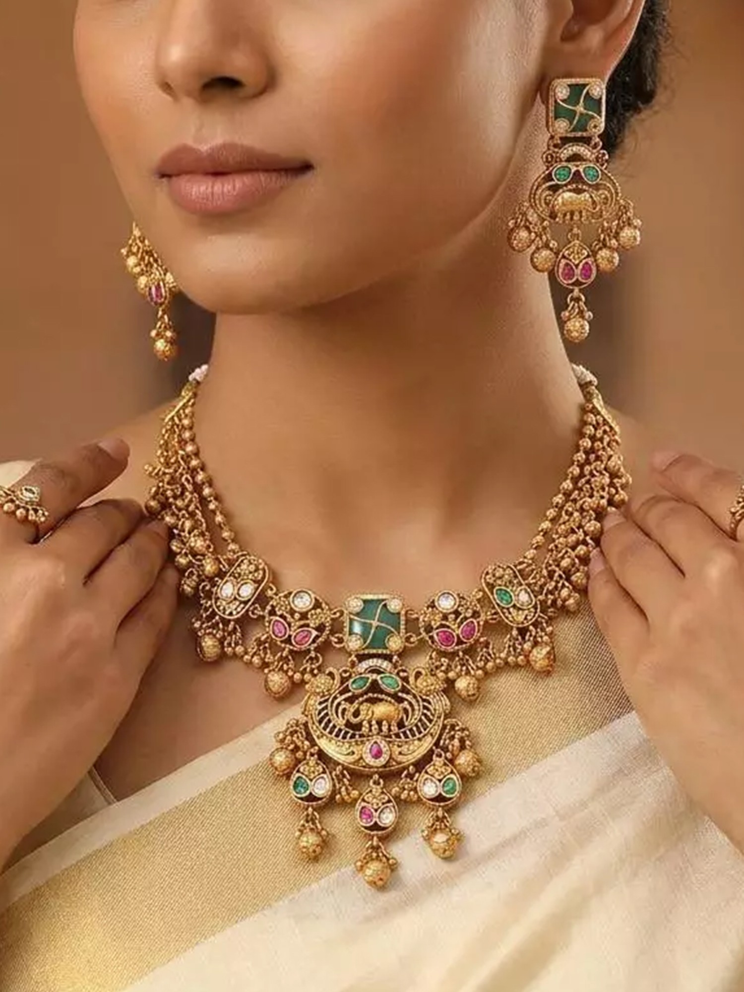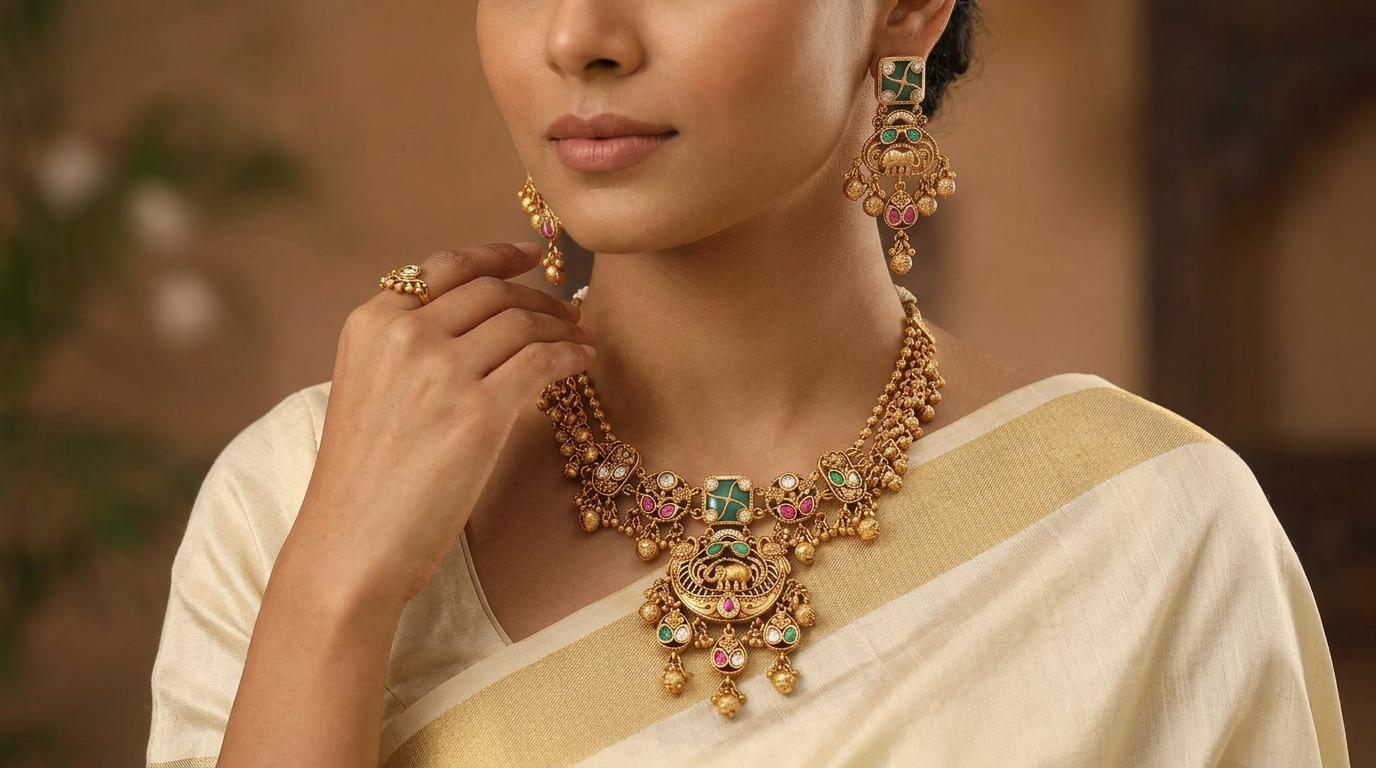 Temple-Style South Indian Elephant Design Kundan Necklace Set