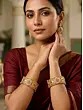 The striking visual appeal lies in the harmonious interplay of polished brass and richly colored Kundan stones, accented by delicate pearls. Each bangle boasts a substantial yet elegant height of one inch, designed to capture attention without overwhelming. The carefully considered inner diameter of 2.20 inches ensures a comfortable and secure fit, while the outer diameter of 2.75 inches provides a pleasing visual presence on your wrist, creating a captivating silhouette.