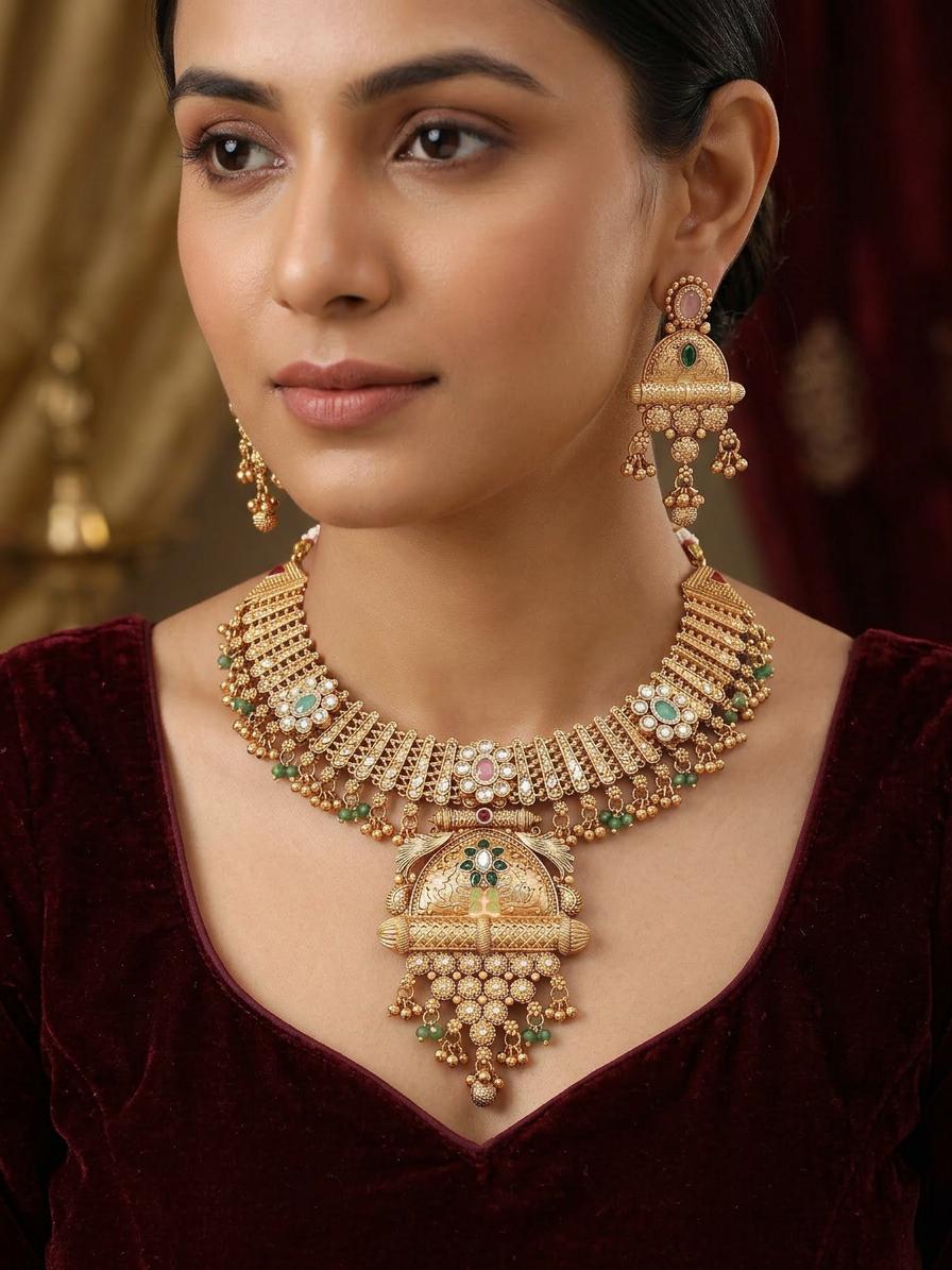 The necklace, with its commanding 6.95-inch height, presents a breathtaking centerpiece featuring a domed pendant adorned with vibrant Kundan stones and intricate filigree work. Delicate ghungroo drops cascade from the pendant and along the intricately textured collar, promising a subtle, melodious chime with every movement. Complementing this masterpiece, the earrings, each measuring 2.10 inches in height and 0.95 inches in width, echo the necklace's ornate design, featuring similar intricate patterns and dangling ghungroos that add a touch of playful sophistication to your look.