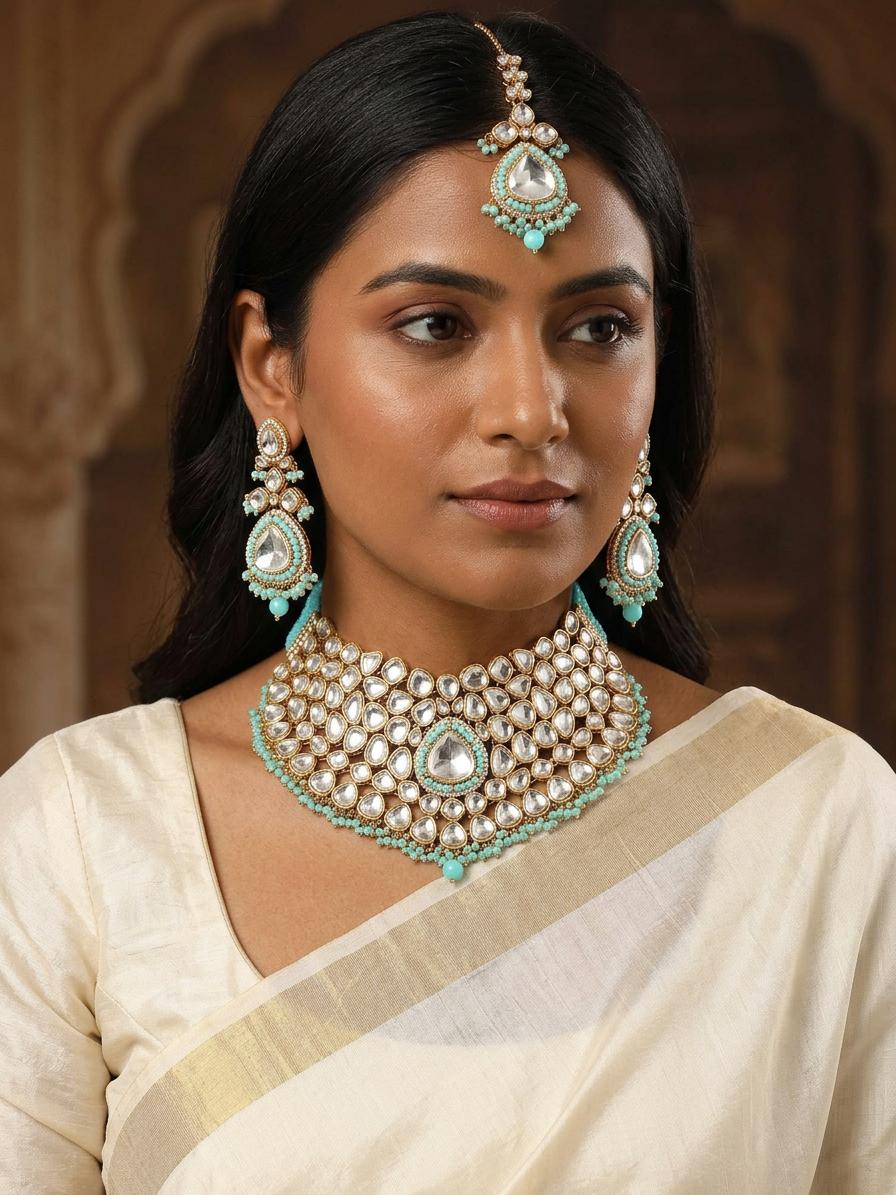 The light blue beads, carefully woven throughout the necklace, earrings, and mangtika, add a touch of refreshing pastel charm. These beads provide a beautiful contrast to the sparkling Kundan stones, enhancing the overall radiance of the jewelry set. The color is subtle enough to pair with various outfits yet vibrant enough to make a statement. Each piece is thoughtfully designed to complement the others, creating a harmonious and balanced ensemble that exudes refined elegance.