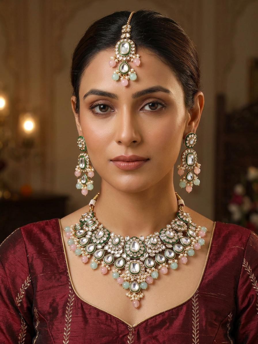Tri-Color Polki Necklace Set with Mang Tika
