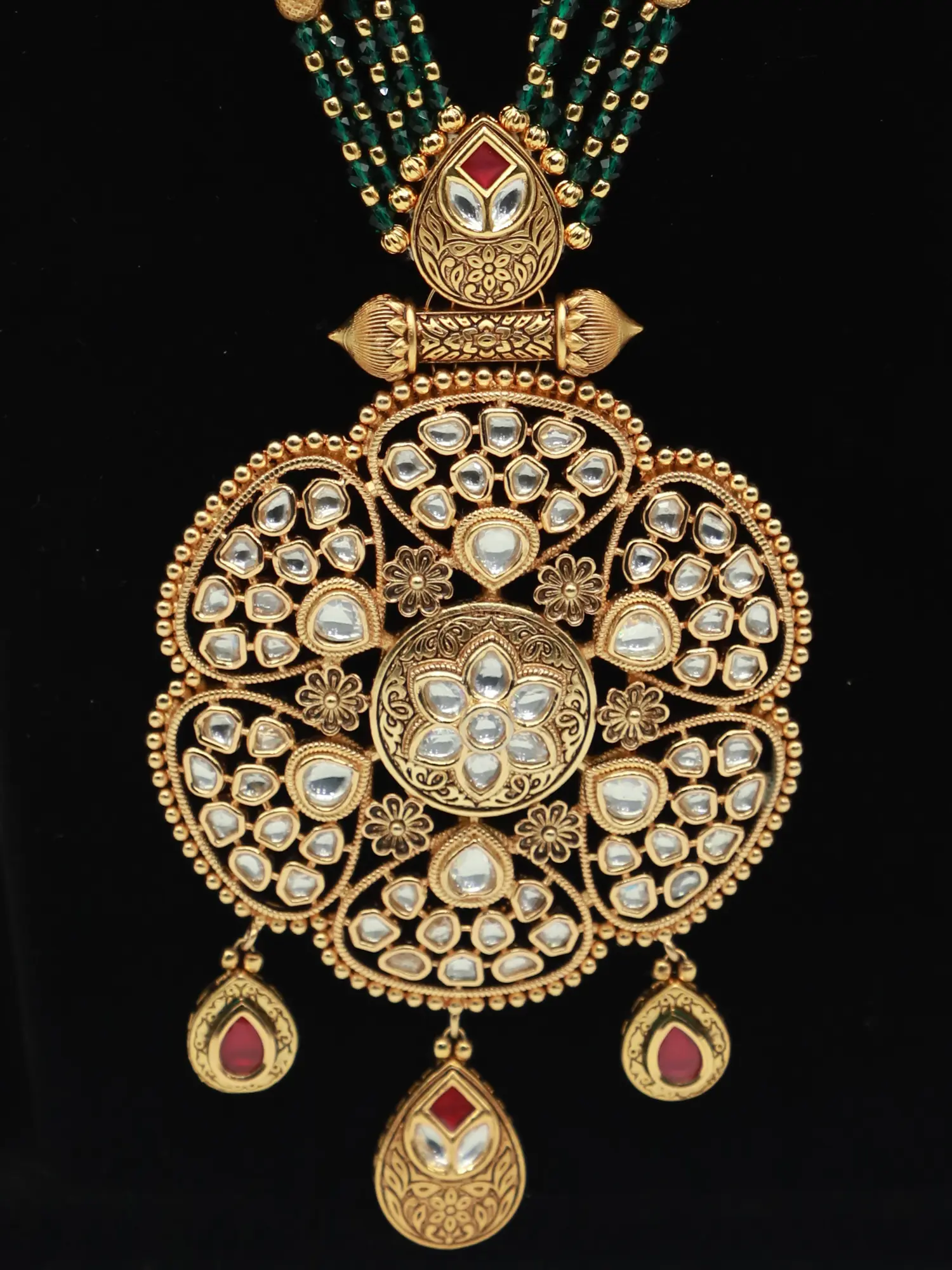 Kundan Studded and Beaded Necklace Set with Earrings and Mangtika