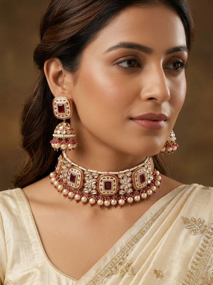 Kundan Studded Meenakari Choker Necklace With Beads And Earrings