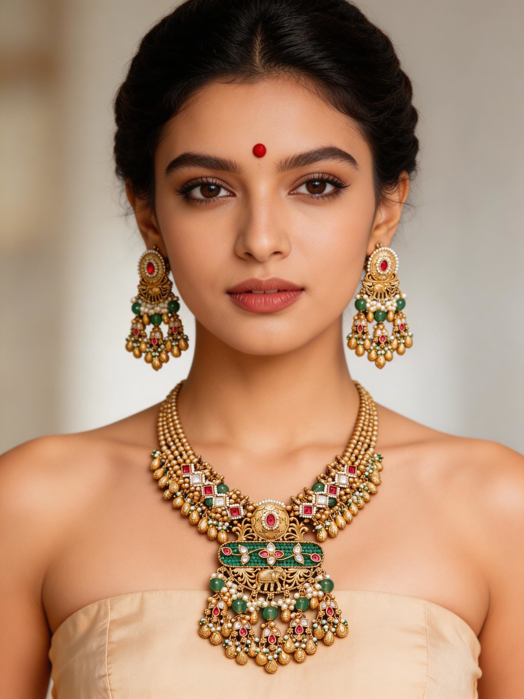 Kundan Lacquer Necklace Set with Emerald and Red Gemstone Drops