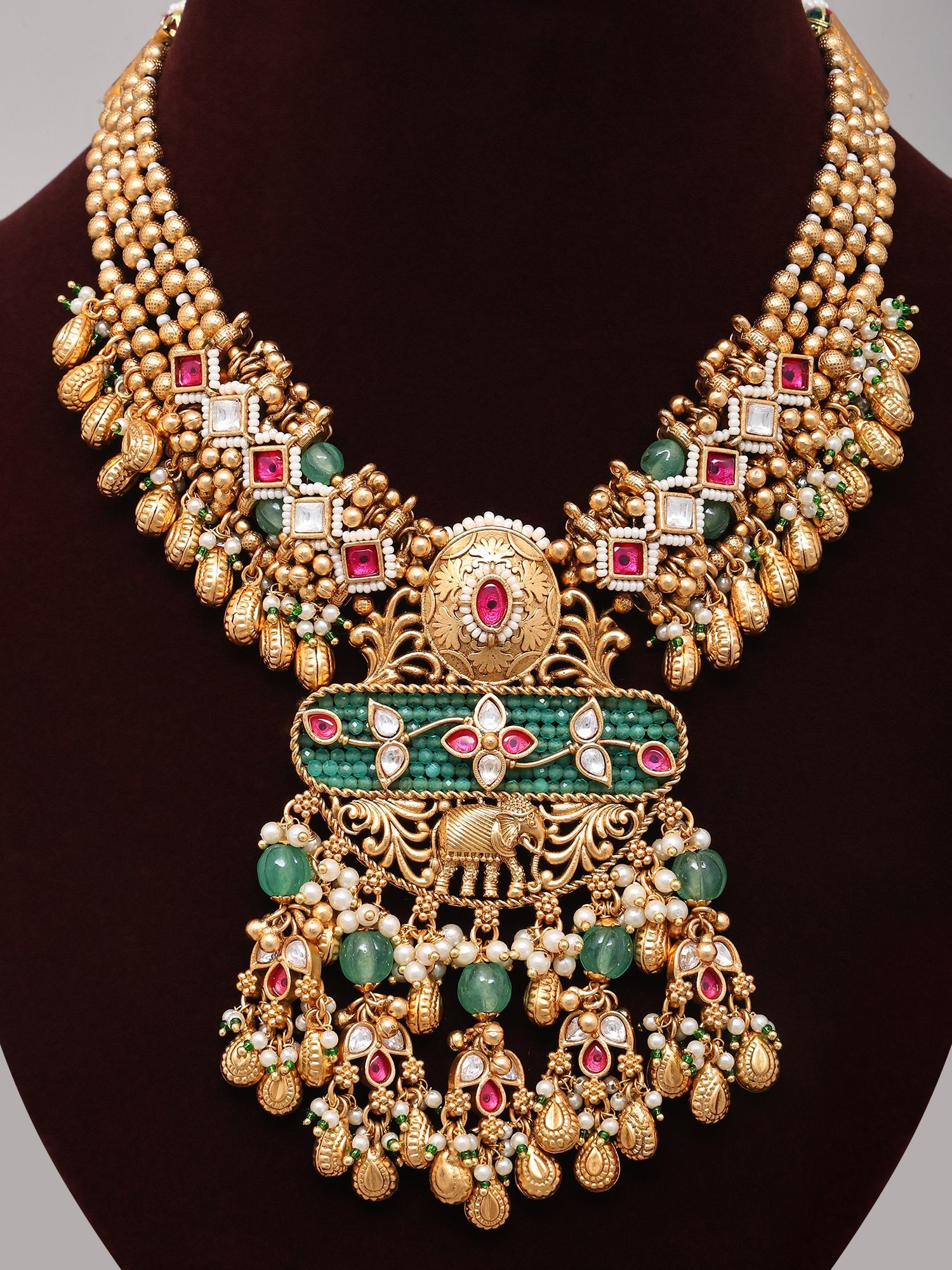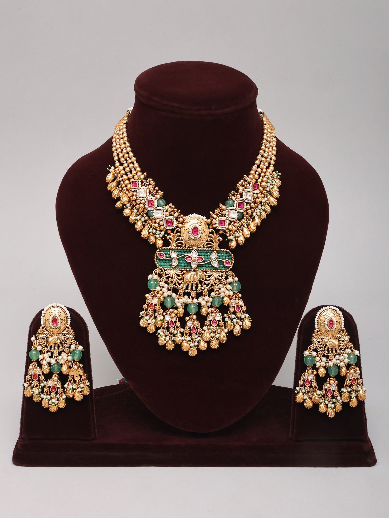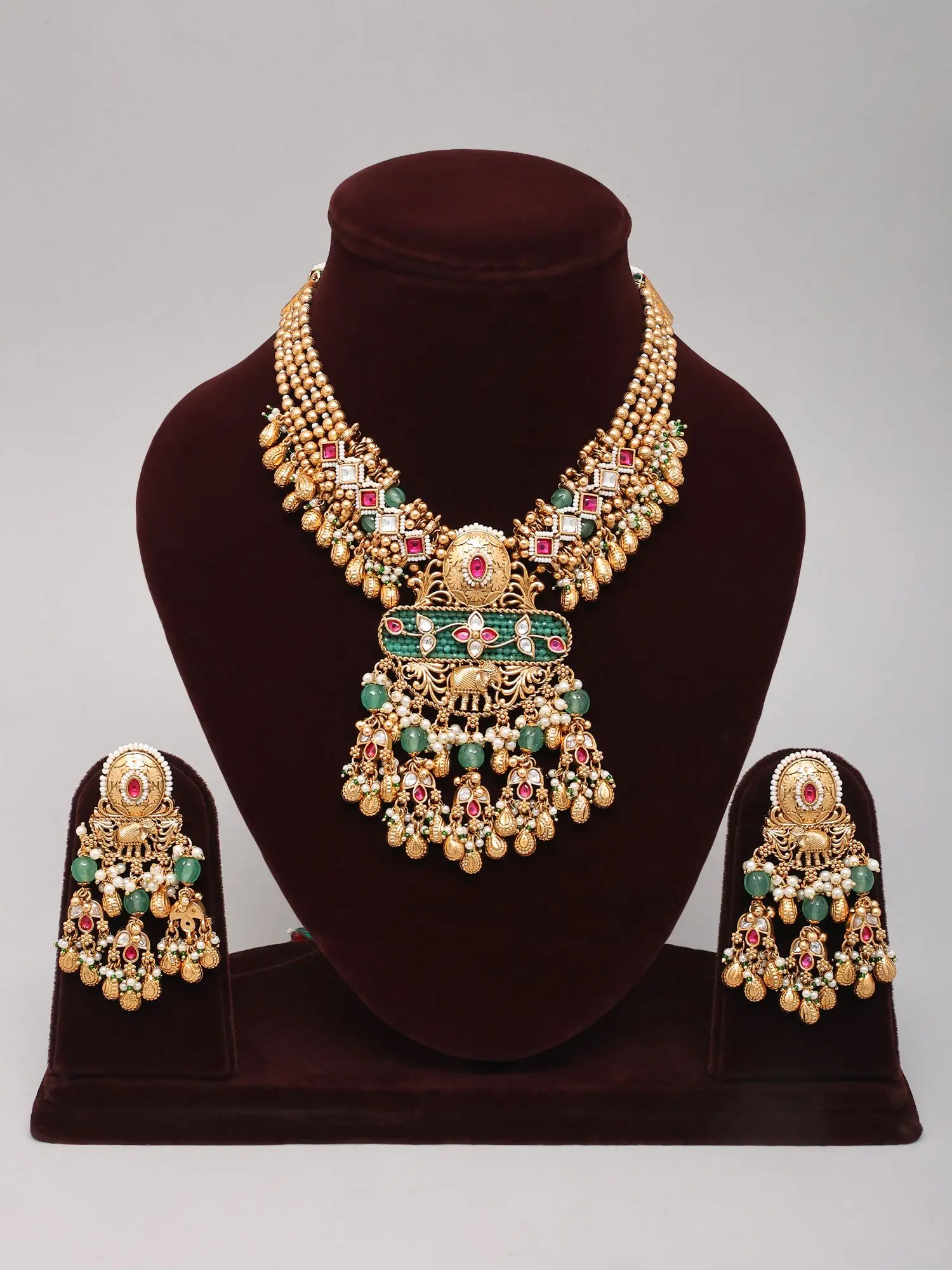 Rajwadi Style Kundan Meenakari Necklace Set with Pearl Drops