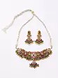 Complementing the magnificent choker are a pair of equally stunning earrings. Echoing the design of the necklace, these earrings feature a fan-shaped motif, adorned with the same vibrant Kundan work and a striking arrangement of semi-precious stones in red, green, and white. Each earring is further embellished with a delicate fringe of golden beads and smaller emerald green stones, creating a beautiful, dangling effect. These earrings are designed to draw attention with their intricate detail and vibrant color palette, adding a harmonious flourish to your overall ensemble. The secure stud backing ensures they remain comfortably in place, allowing you to move with confidence and grace.