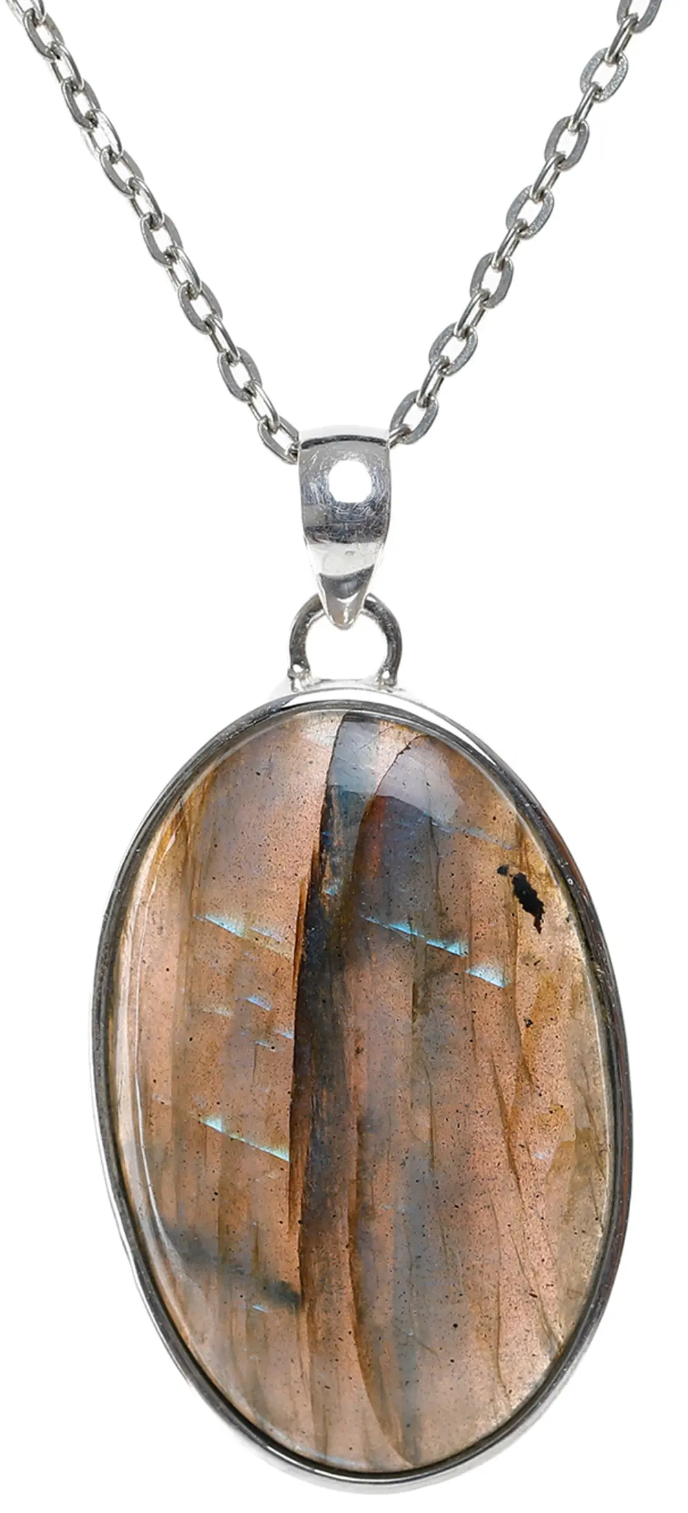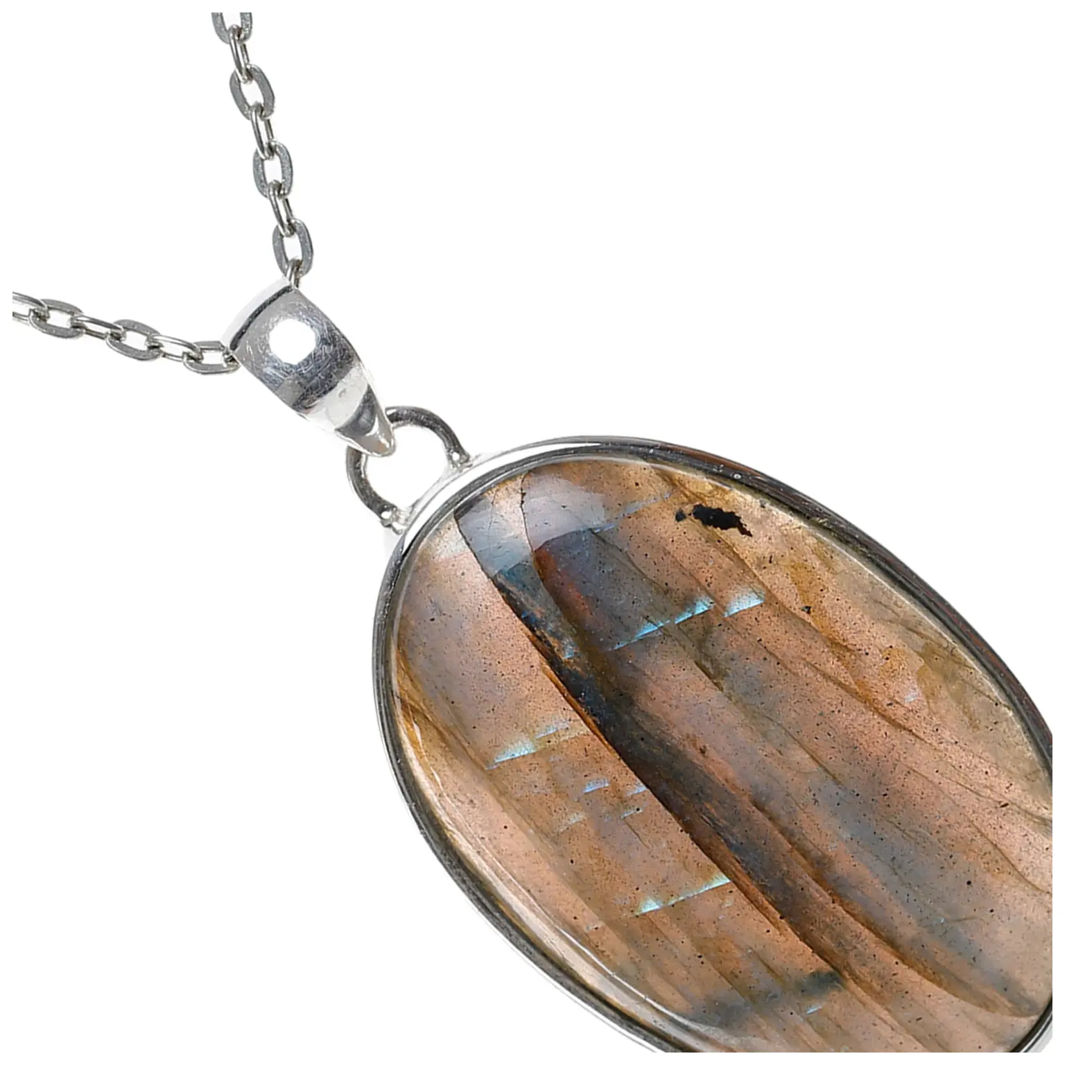 The labradorite is set in a simple yet elegant sterling silver bezel that complements the stone's natural beauty without overpowering it. The oval shape of the pendant gives it a classic appeal, making it a versatile piece that can be worn with any outfit, whether you're aiming for a casual look or dressing up for a special occasion.