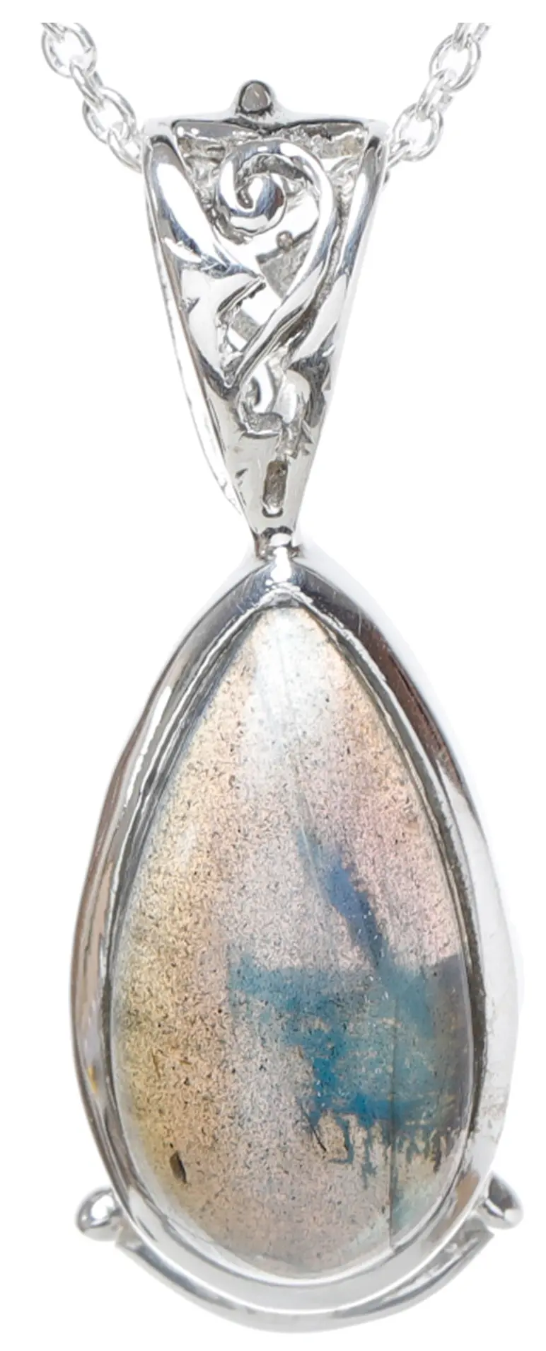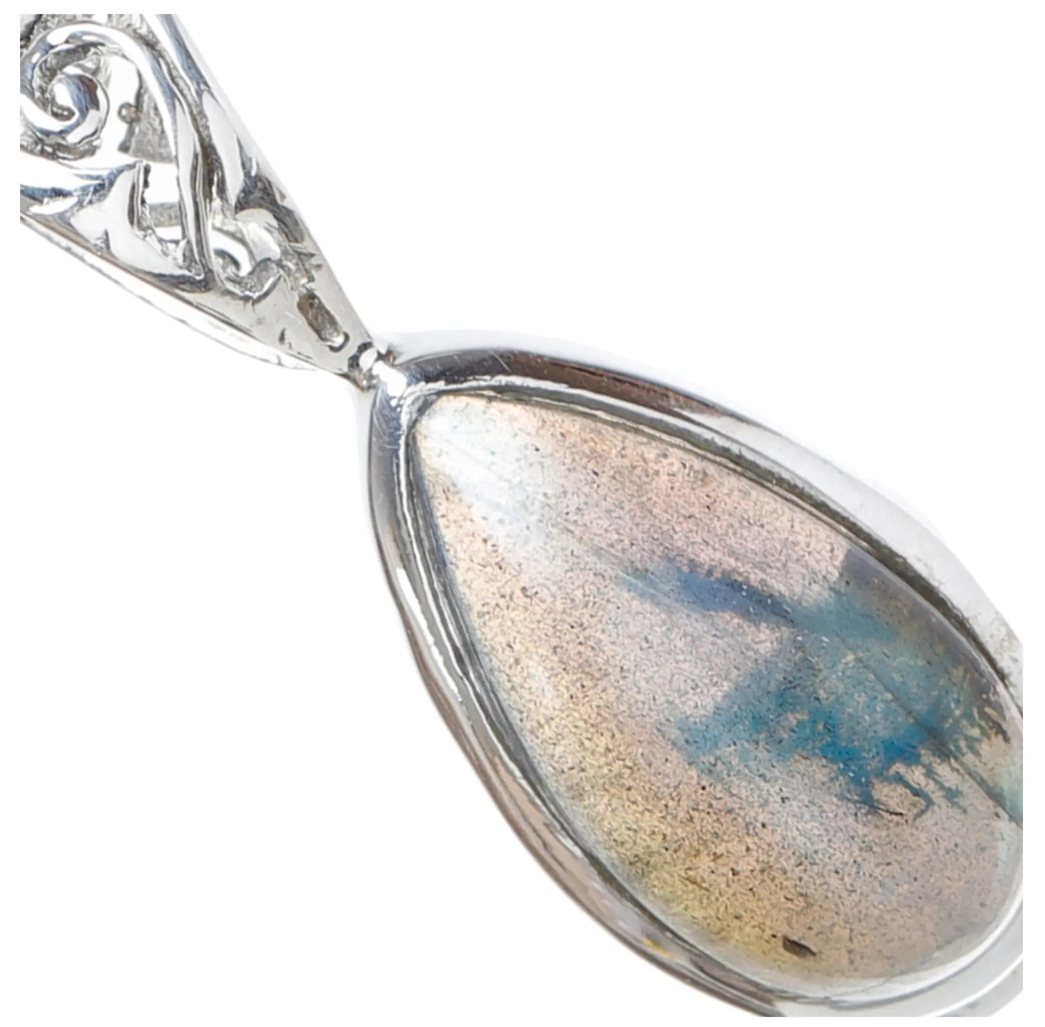 The ethereal beauty of the labradorite is masterfully framed by a sophisticated sterling silver setting. The cool, bright gleam of the silver complements the labradorite's otherworldly colors, enhancing its natural radiance without overpowering it. The intricate swirl design adorning the bail adds a touch of vintage charm and intricate detail, showcasing a commitment to fine craftsmanship. This carefully chosen metal not only adds a luxurious feel but also ensures the longevity and durability of the pendant, making it a treasured accessory for years to come.