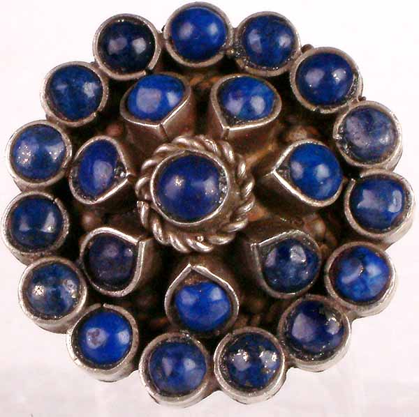 The artistry shines in its meticulously crafted setting. Sterling silver provides a cool, lustrous backdrop that perfectly complements the warm, saturated tones of the lapis lazuli. Each cabochon is carefully set, showcasing the stone's natural beauty and creating a harmonious balance of texture and color. The arrangement of stones resembles a delicate bloom, each "petal" radiating from the center. The ring’s design balances boldness with wearability, ensuring it can be worn both as a statement piece and as an everyday treasure. Its size makes it a noticeable yet comfortable addition to any jewelry collection.