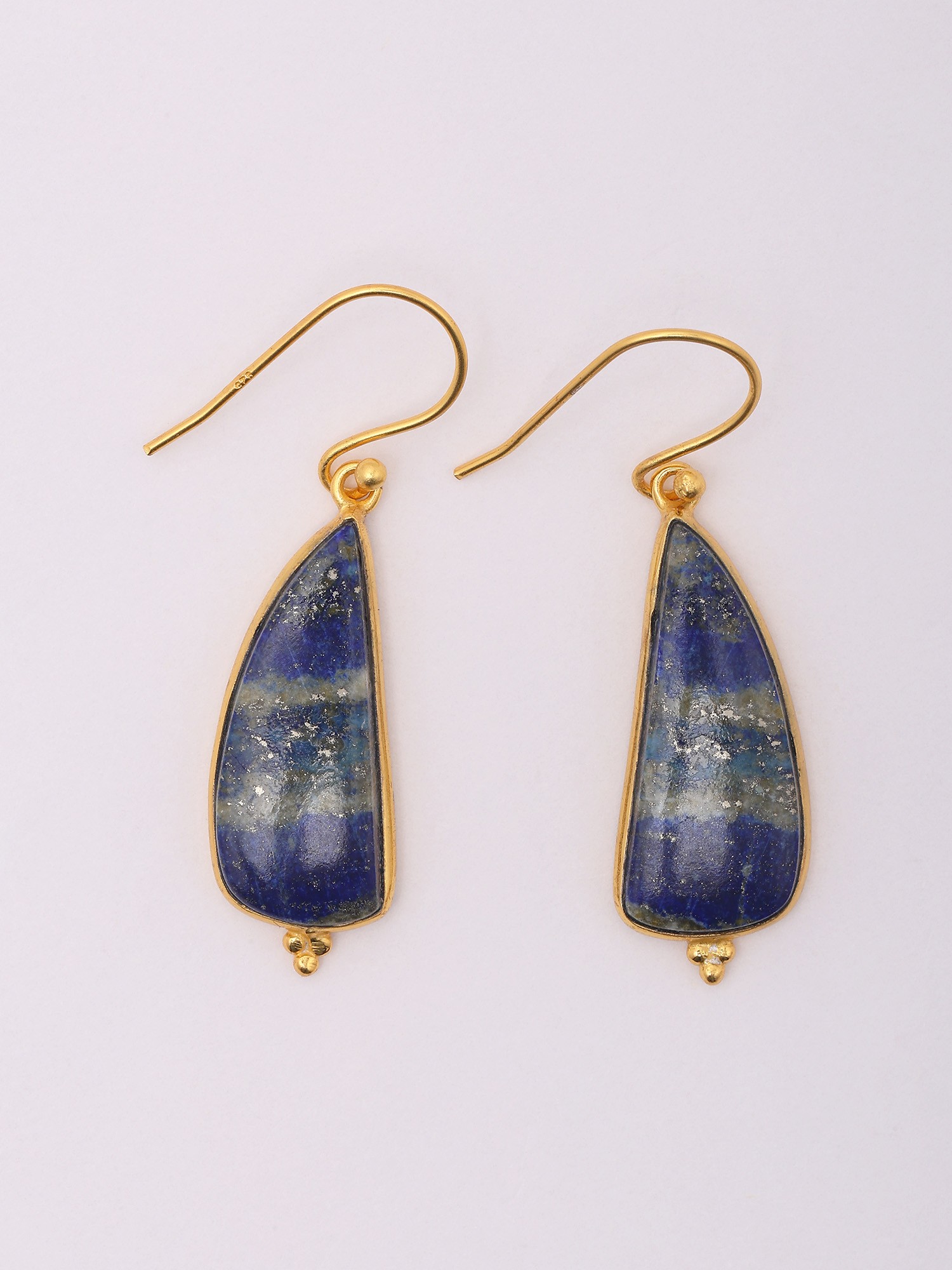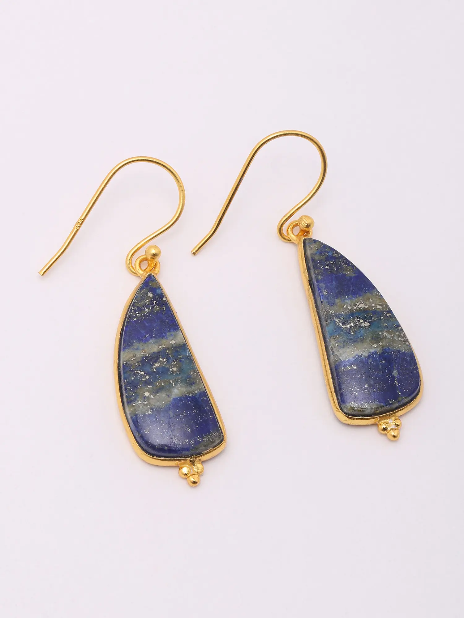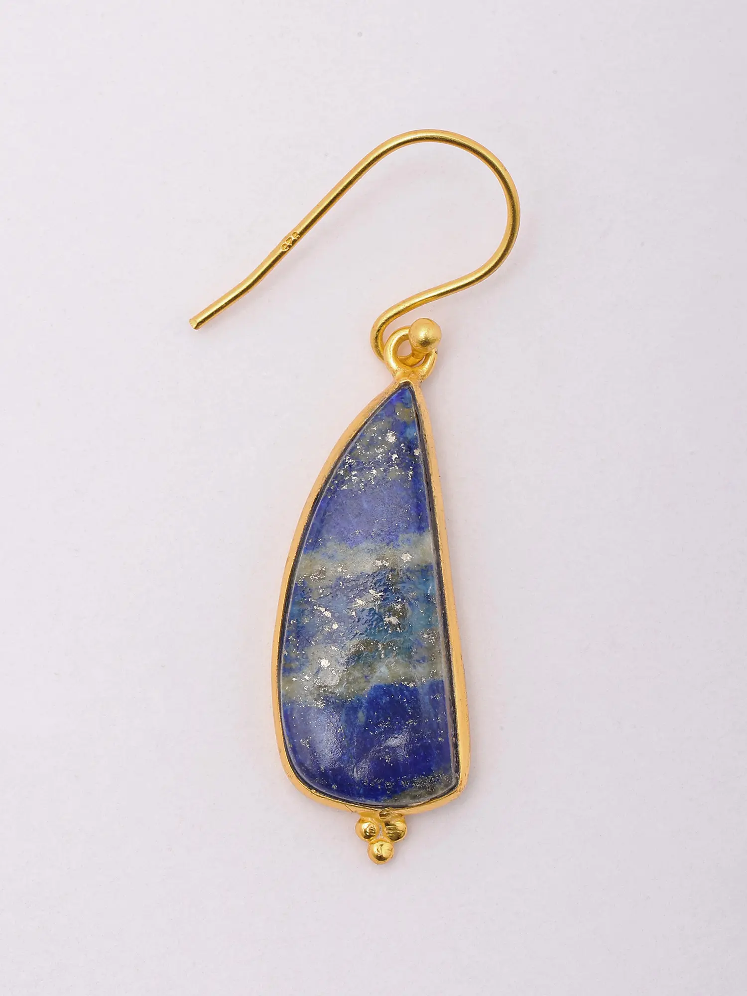 Adorn yourself with the mesmerizing allure of these handcrafted earrings. Each piece features a captivating Lapis Lazuli gemstone, celebrated for its deep, celestial blue hues and subtle shimmering inclusions. The natural variations within the stone ensure that every pair is beautifully unique, a miniature work of art reflecting the depths of the night sky. The earrings offer a unique shape with a slight, asymmetrical curve. These earrings are more than just an accessory; they're a conversation starter, a statement of refined taste, and a connection to centuries of artistry.