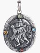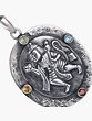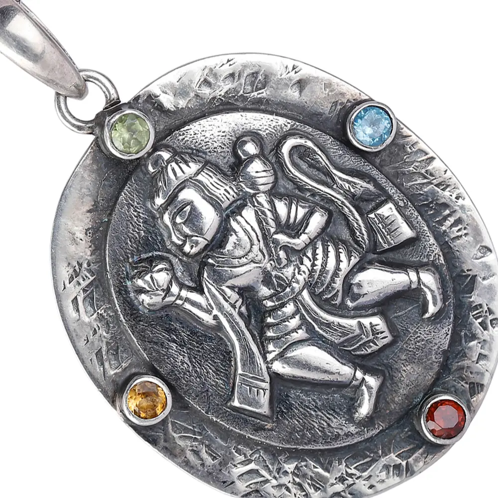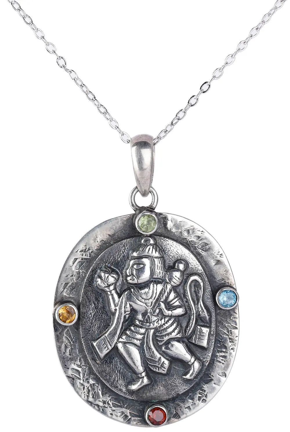 Embrace the divine energy of Lord Hanuman with this exquisitely crafted sterling silver pendant. Revered as a paragon of strength, loyalty, and selfless devotion, Hanuman is an enduring symbol of courage and perseverance. This pendant captures the essence of this beloved deity in a design that is both powerful and aesthetically pleasing, making it a meaningful addition to any jewelry collection. The pendant features a detailed, three-dimensional depiction of Lord Hanuman, rendered in lustrous sterling silver. His dynamic pose and serene expression convey his unwavering commitment and divine power. The intricate detailing showcases the skill of the artisan, bringing this sacred figure to life. Surrounding Hanuman is a textured border, reminiscent of ancient carvings, which adds depth and character to the piece. Four vibrant gemstones are carefully set into the pendant, each adding a touch of color and symbolic significance. These carefully chosen gems enhance the overall beauty of the pendant, creating a harmonious blend of metalwork and precious stones. This pendant is more than just a beautiful accessory; it is a wearable statement of faith and an embodiment of the virtues that Lord Hanuman represents. Whether worn for spiritual reasons or as a distinctive piece of jewelry, it serves as a constant reminder of inner strength and the power of devotion. The sterling silver construction ensures durability and a lasting shine, making this pendant a cherished heirloom for years to come. Its substantial size and detailed craftsmanship make it a focal point, drawing admiration and sparking conversation. This pendant is ideal for daily wear or for special occasions, offering a touch of spiritual grace and an undeniable sense of presence. It makes for a thoughtful and significant gift for anyone seeking inspiration and protection, or as a personal token of empowerment.