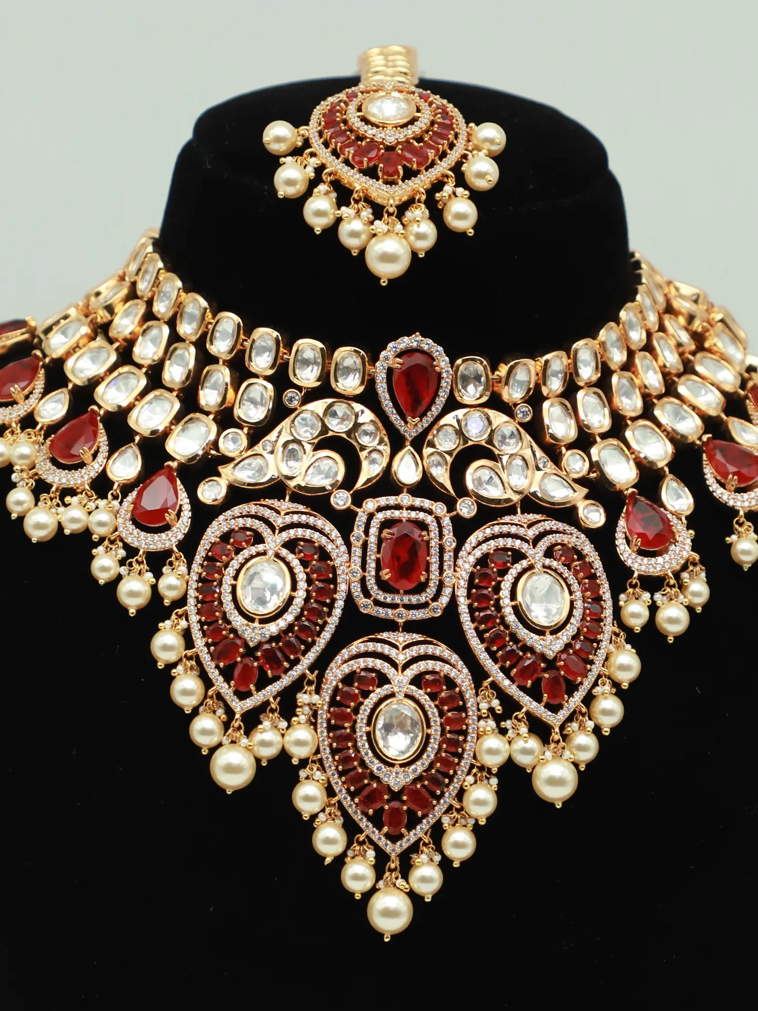 Red Kundan Stone Heavy Necklace Set With Mangtika And Earrings