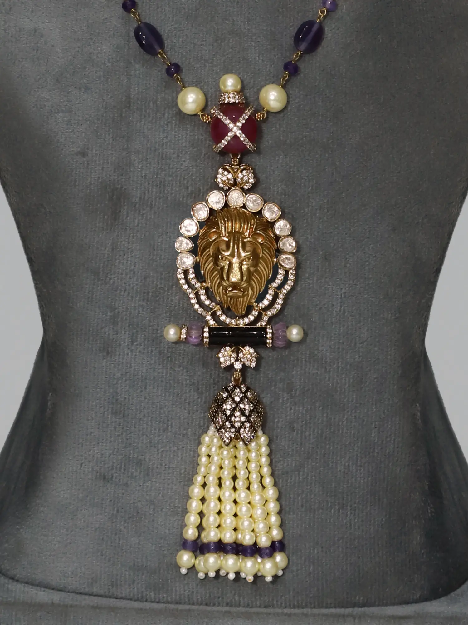 Lion Face Long Beaded Elegant Necklace Set With Earrings