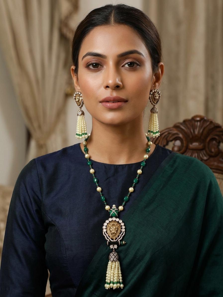 Make a statement with this exquisite Lion Face Long Beaded Elegant Necklace Set, a captivating blend of regal symbolism and sophisticated design. This stunning jewelry set is meticulously crafted using high-quality brass, featuring a striking lion head pendant that commands attention. The intricate detailing and sparkling accents elevate this piece to a true heirloom. The rich, deep green beads contrast beautifully with creamy white pearls, creating a visually stunning effect. Whether you're attending a special occasion or want to add a touch of elegance to your everyday style, this necklace set is the perfect choice.