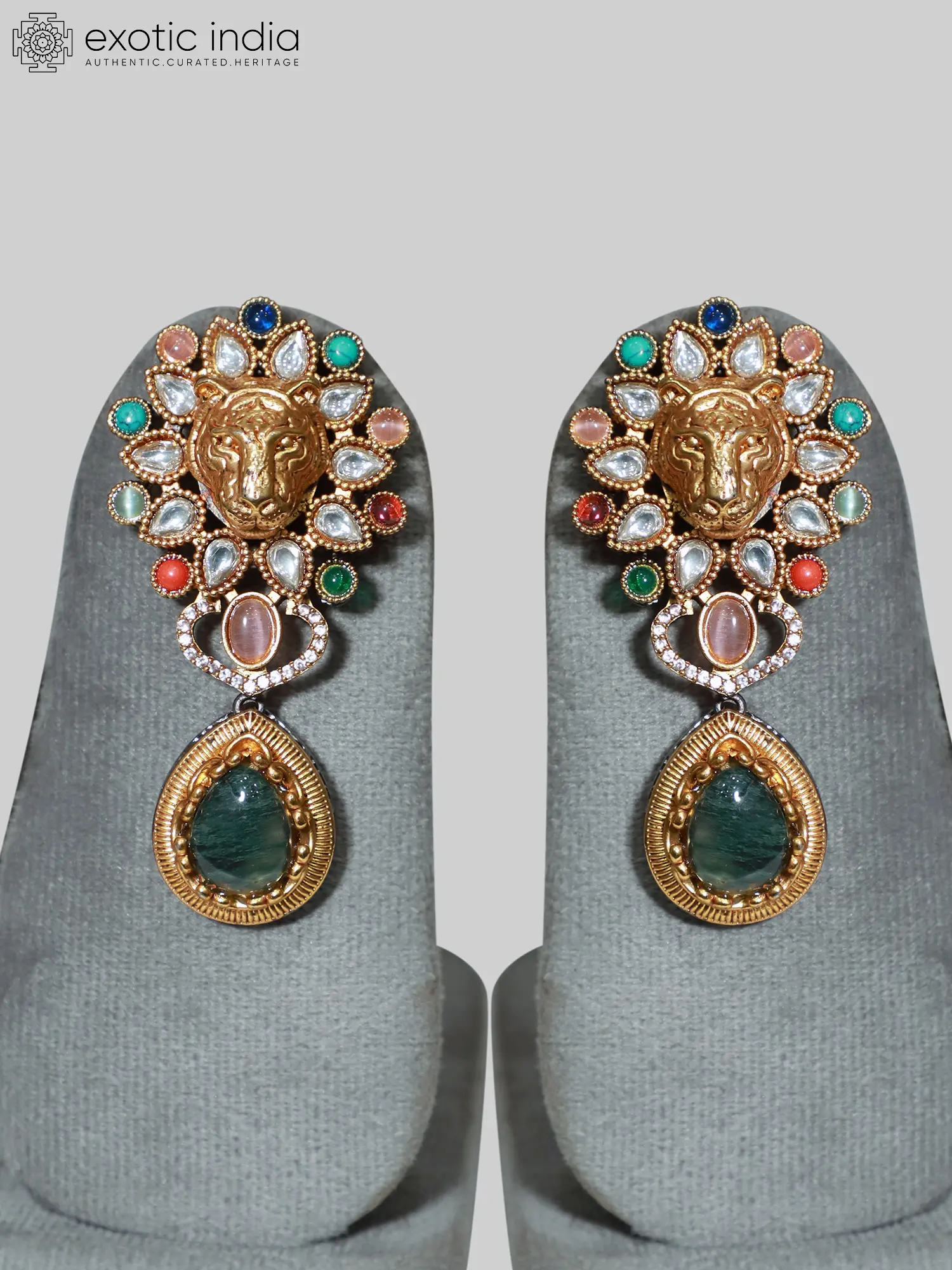 Adorn yourself with the captivating allure of our Lion Face Stone Studded Designer Jewelry Set. This exquisite ensemble, meticulously crafted from brass, exudes a regal aura that's perfect for adding a touch of fierce elegance to any occasion. The intricate detailing and vibrant gemstone accents transform this piece into a true statement of sophisticated style. Whether you're attending a special event or simply want to elevate your everyday look, this set is designed to make you feel like royalty. The rich golden tones complement a variety of skin tones and outfits, ensuring that you’ll always feel confident and beautiful wearing this piece.