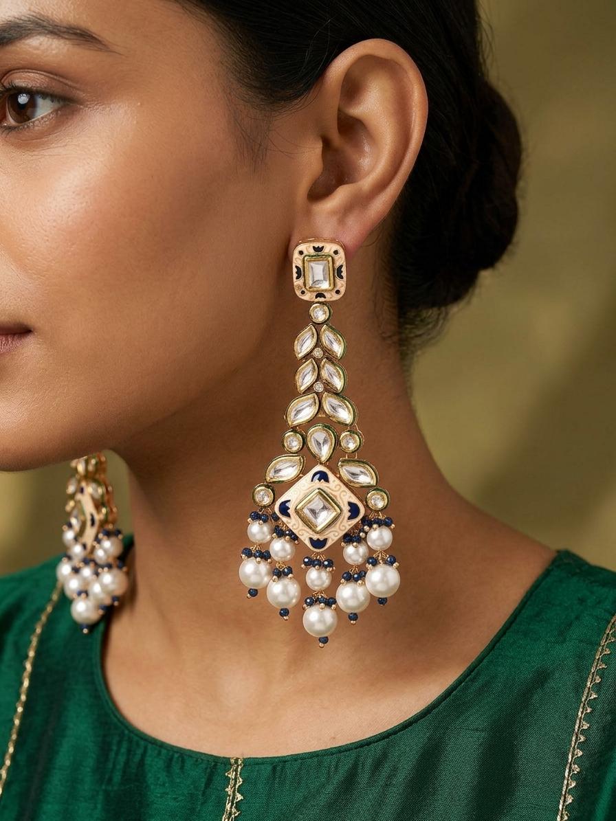Statement Kundan Dangle Earrings with Geometric Design & Pearl Accents