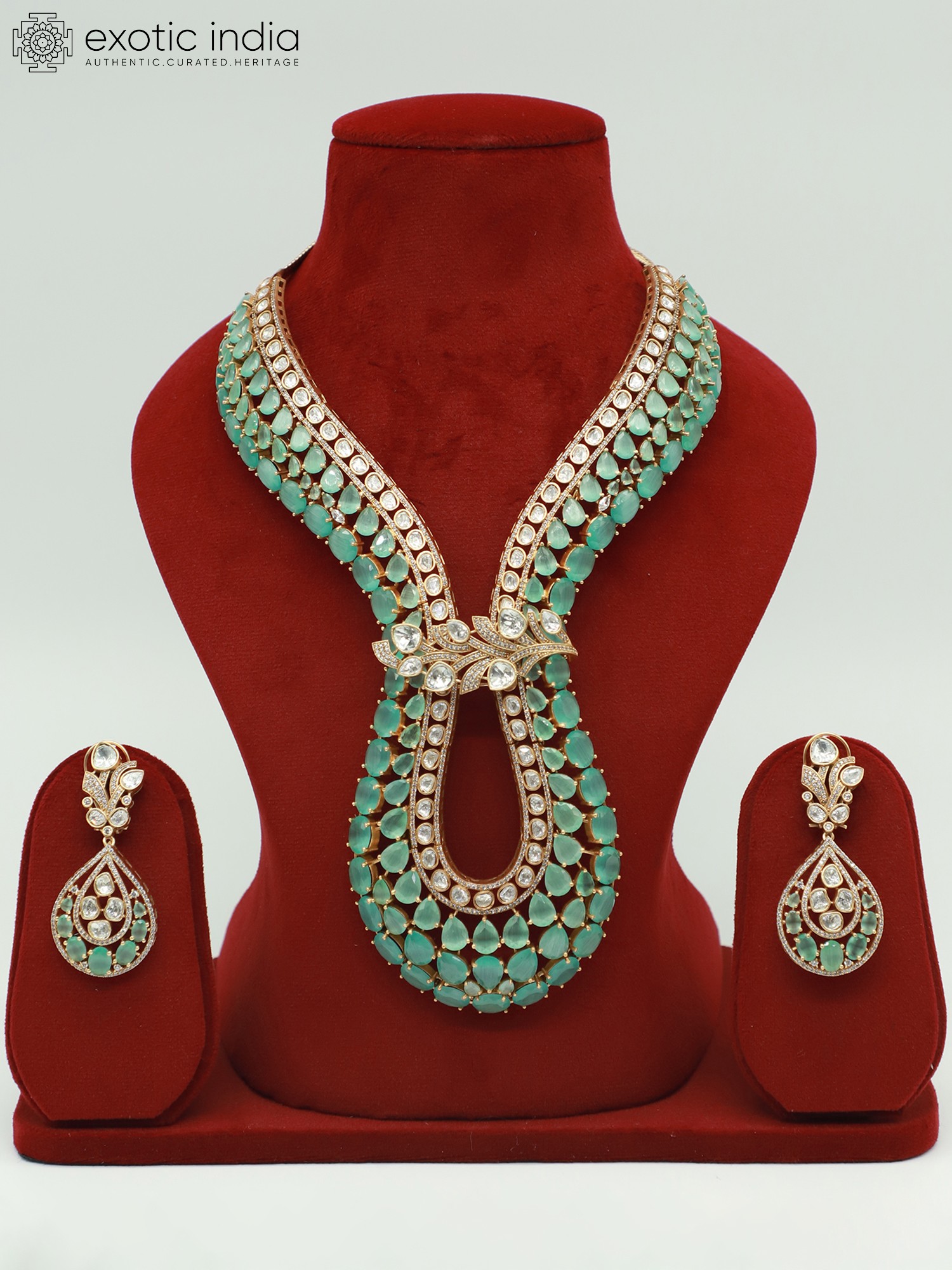 Stunning Moissanite Kundan With Matt Polish Stone Studded Necklace With Teardrop Earrings