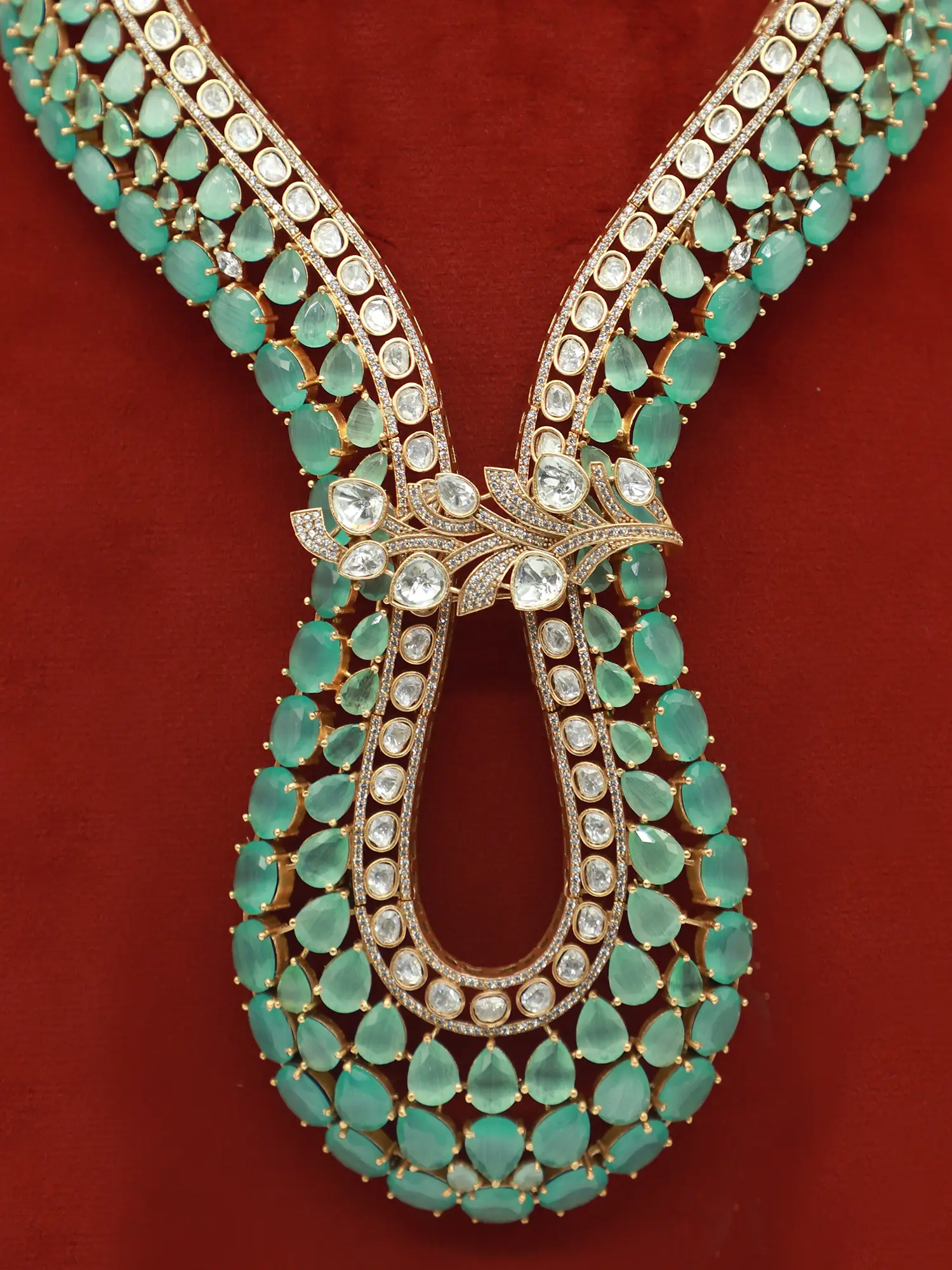 Whether you're attending a grand celebration or simply seeking to elevate your everyday style, this jewelry set is the perfect choice. Its classic design allows it to be paired with a wide range of outfits, from traditional Indian attire to modern western ensembles. Wear it to a wedding, a festive gathering, or a special occasion, and be prepared to receive compliments on your impeccable taste. The soft green gemstones are carefully selected for their clarity and vibrant color, adding a touch of nature-inspired beauty to the design. The gold-toned setting complements the stones perfectly, creating a warm and inviting aesthetic. Together, the gemstones and metalwork create a harmonious balance of color and texture, making this set a true work of art.