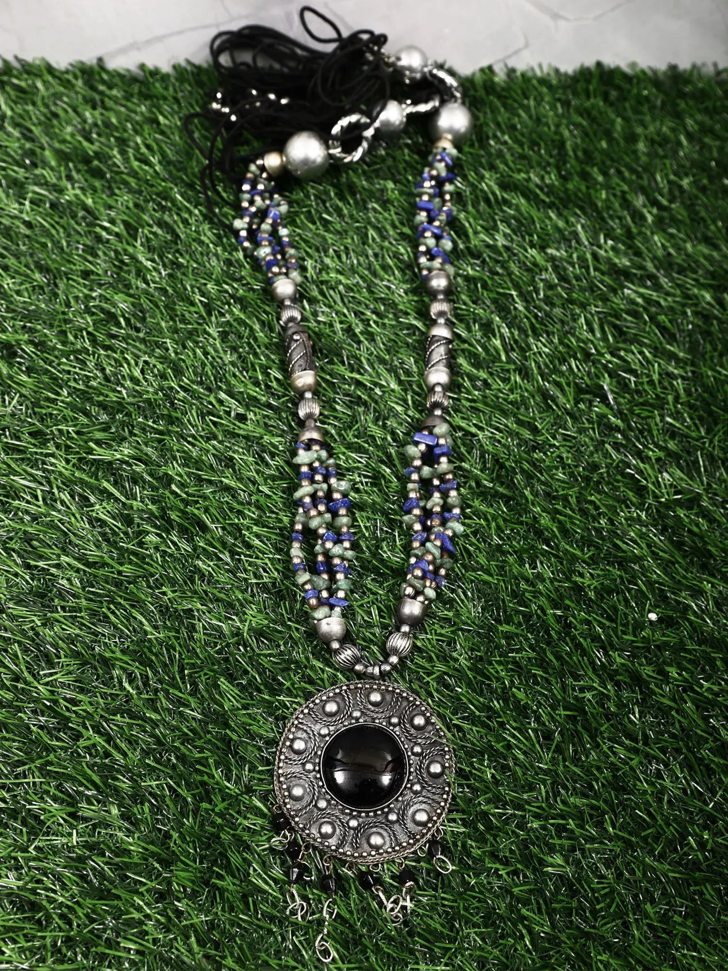 At the heart of this necklace lies a mesmerizing pendant. This circular focal point features a smooth, dark gemstone cabochon, framed by intricate metalwork. The border is decorated with meticulously placed metal beads and twisted wire details, adding depth and texture to the overall design. Dangling from the pendant are delicate chains and dark crystal beads, catching the light with every movement and creating a subtle, elegant sway. The necklace itself is comprised of multiple strands of gemstone chips – a beautiful blend of rich blues and earthy greens. These complementary colors work together to create a harmonious and visually appealing contrast. The strands are brought together by decorative silver-tone metal beads, adding to the overall sophisticated and artisanal feel. The metalwork is made of a durable metal, with careful attention to detail.