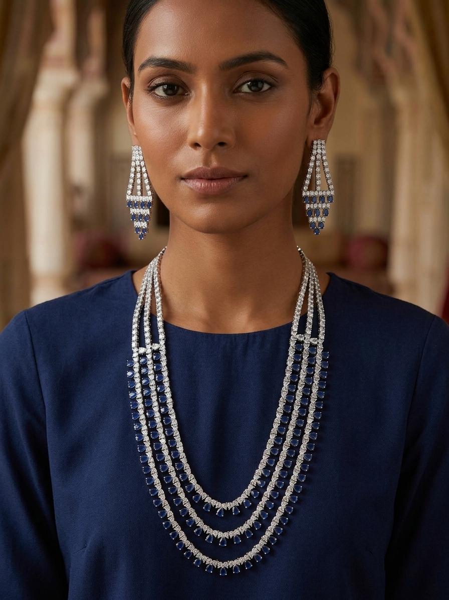 The necklace is designed with careful attention to detail. The strategic placement of the stones ensures maximum brilliance and a balanced aesthetic. The graduating lengths of the three strands create a visually appealing and flattering silhouette that complements the neckline. The earrings echo the design elements of the necklace, creating a cohesive and polished look. They are lightweight and comfortable to wear, allowing you to enjoy your event without any distractions.