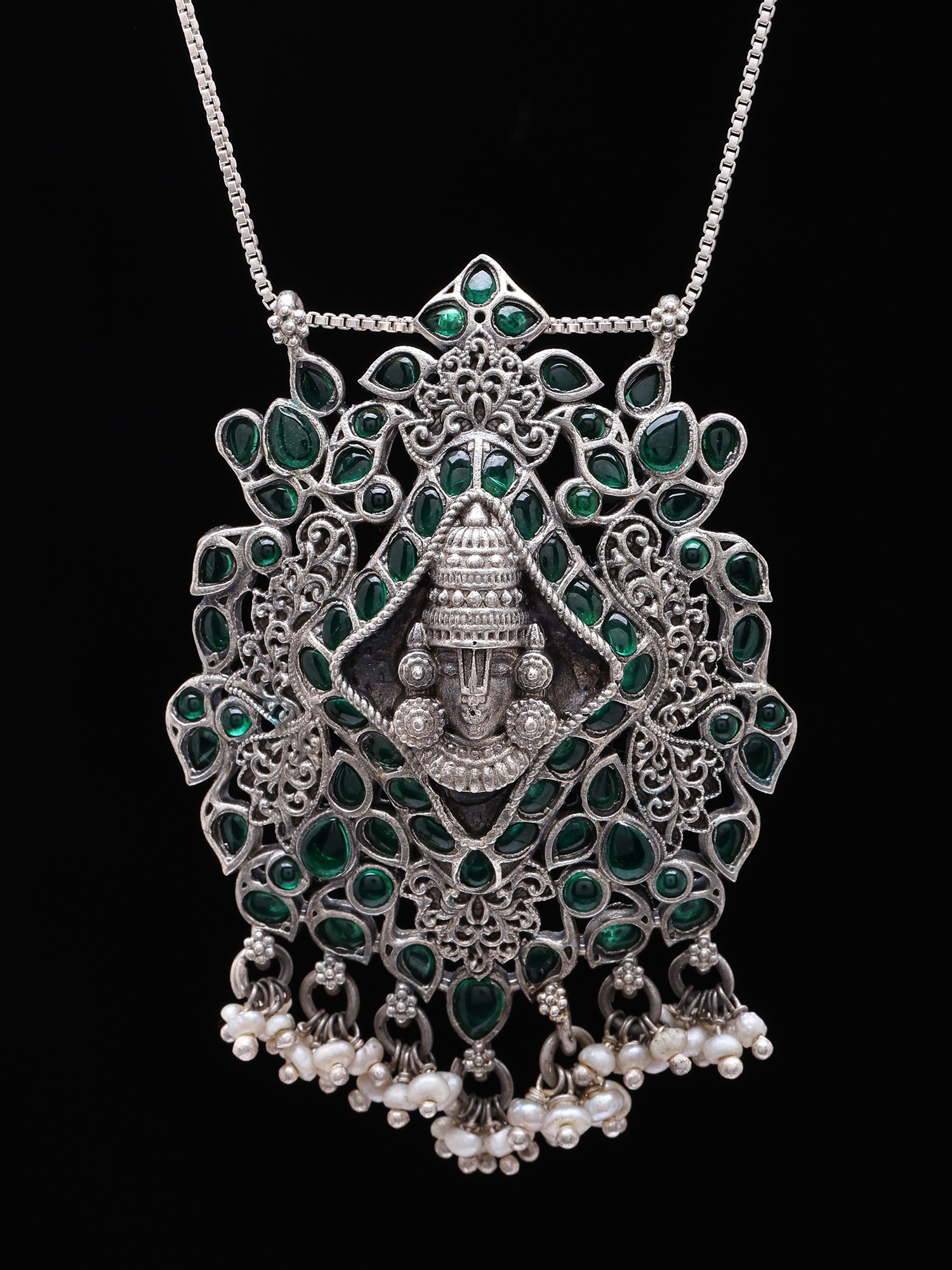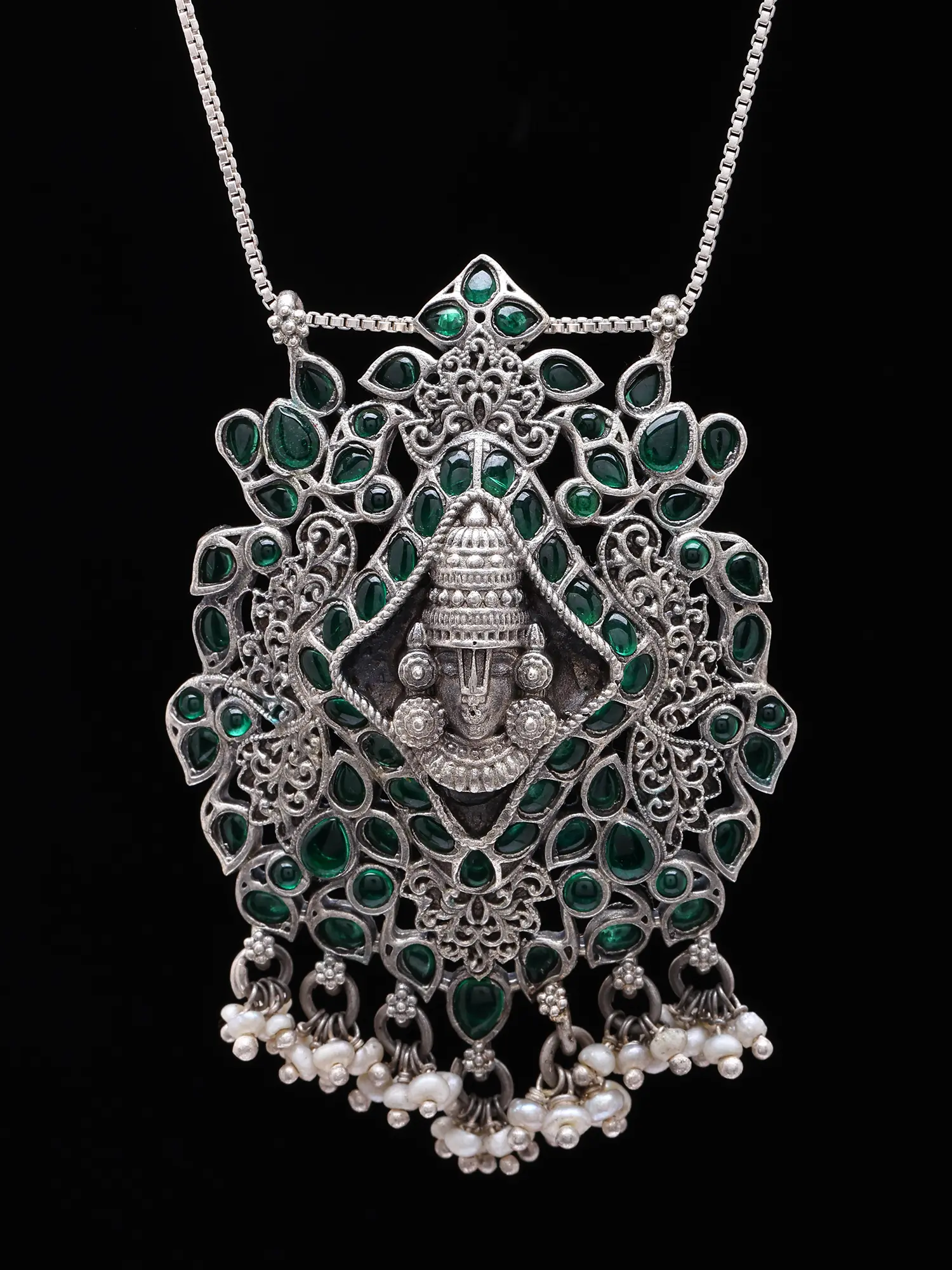 Each element of this piece is a testament to the dedication of skilled artisans. Meticulously crafted from pure sterling silver, it showcases a rich, oxidised finish that lends a captivating depth and antique charm. The central motif is framed by a cascade of vibrant green gemstones and delicate pearl drops, each hand-set to ensure lasting brilliance and a whisper-light, fluid movement.