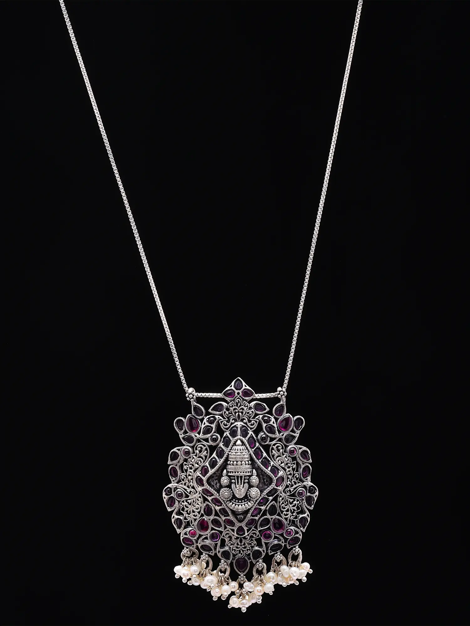 Lord Balaji Face Oxidised Silver Pendant with Pearl Drops