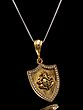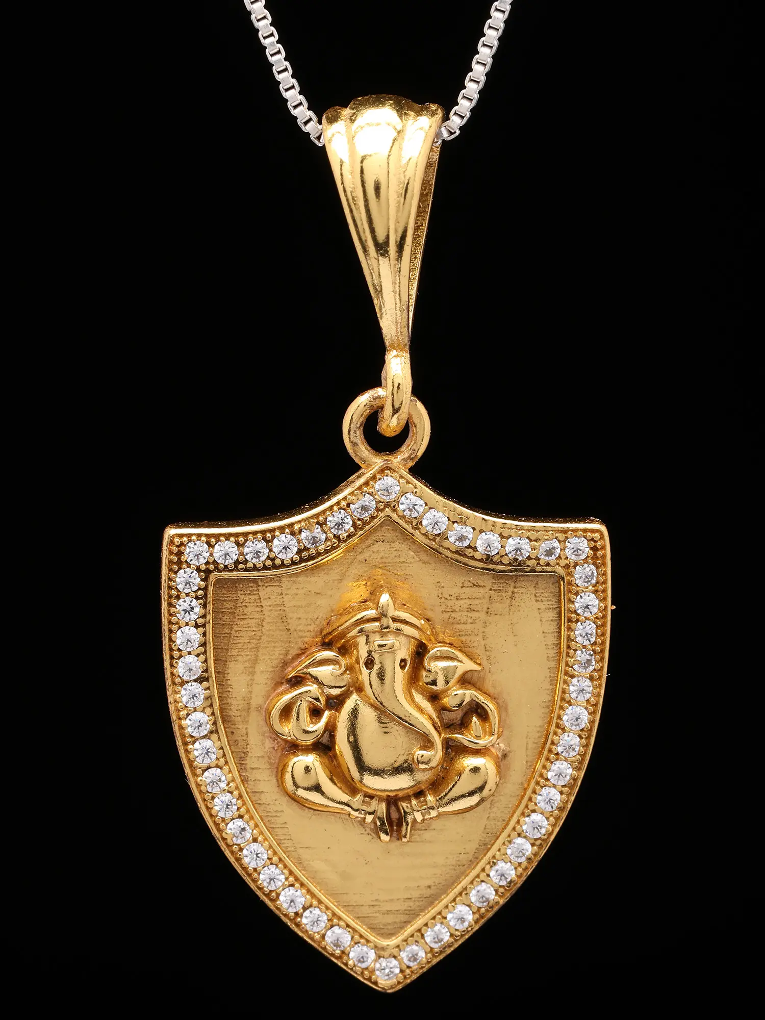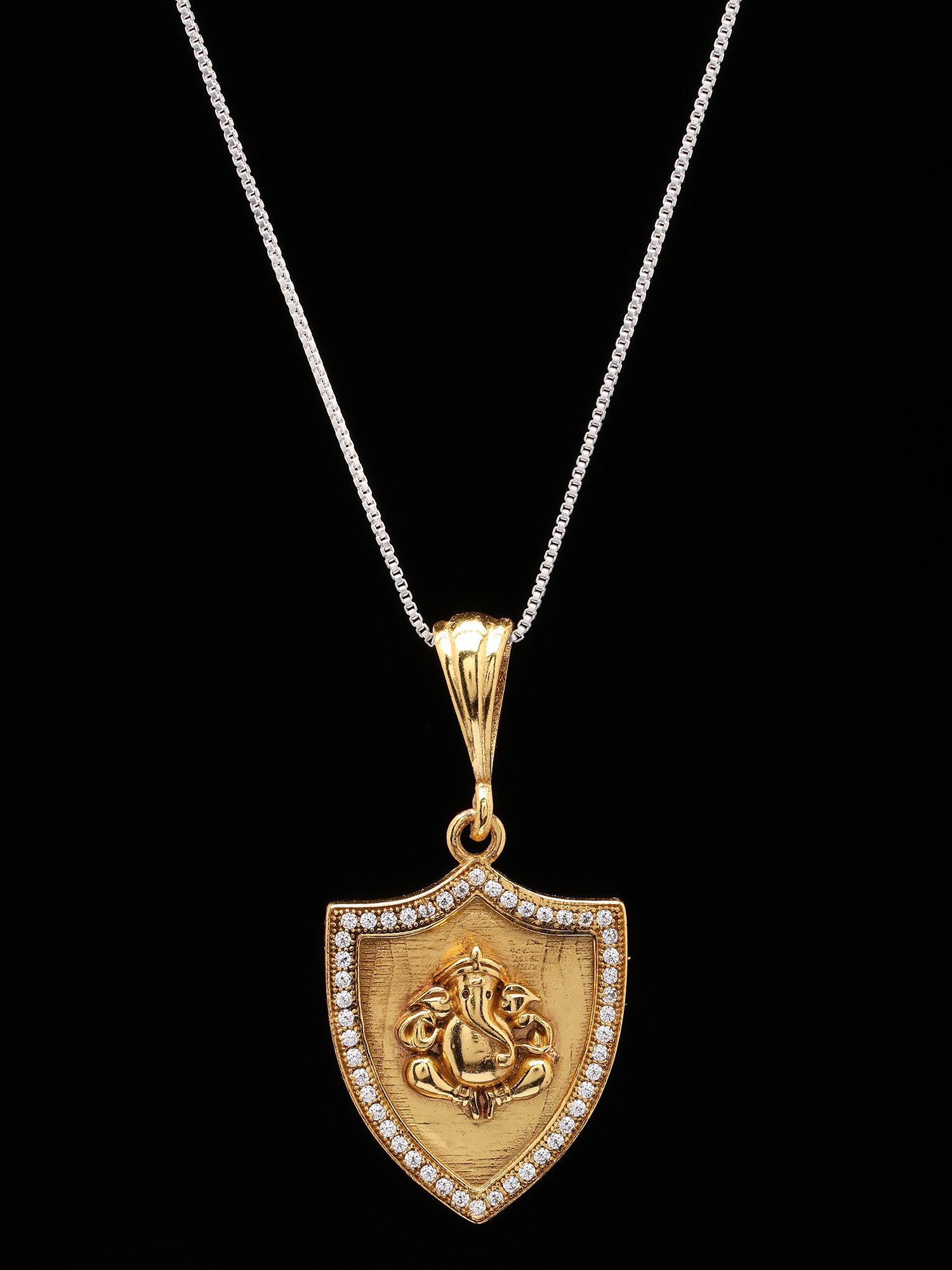 The pendant's design is a harmonious blend of tradition and modern aesthetics. The choice of brass lends a warm, golden hue to the pendant, evoking a sense of timelessness and enduring value. The smooth, polished finish enhances the metal's natural luster, creating a captivating visual appeal. A shield-shaped frame surrounds Ganesha, adding a touch of strength and protection to the pendant's symbolism. The frame is inlaid with a dazzling array of brilliant stones, catching the light and adding a subtle sparkle to the design. The contrast between the warm brass and the glittering stones creates a dynamic and eye-catching effect.