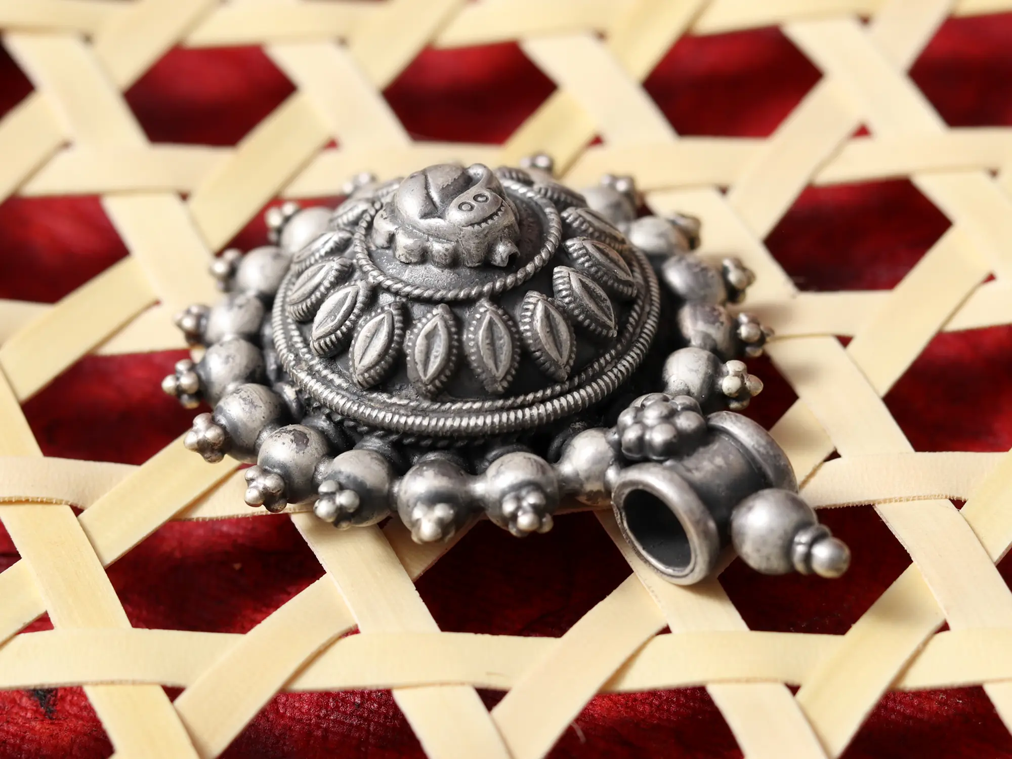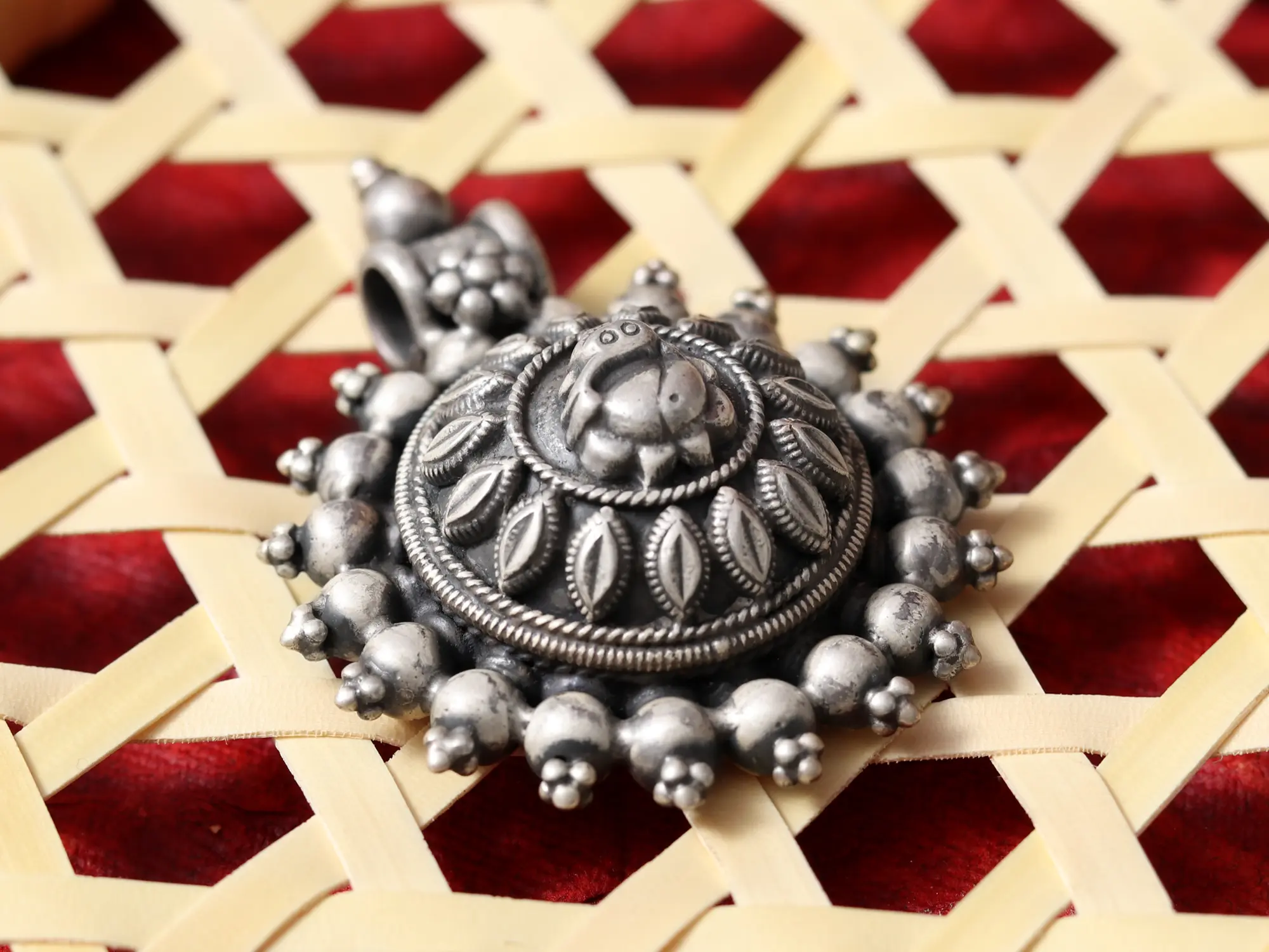Drawing inspiration from the revered South Indian temple jewelry tradition, this pendant carries a rich cultural narrative. It is an embodiment of devotion and artistry that has been passed down through generations, reflecting a deep connection to spiritual heritage. You will appreciate the authentic craftsmanship that echoes centuries of skilled silversmithing.