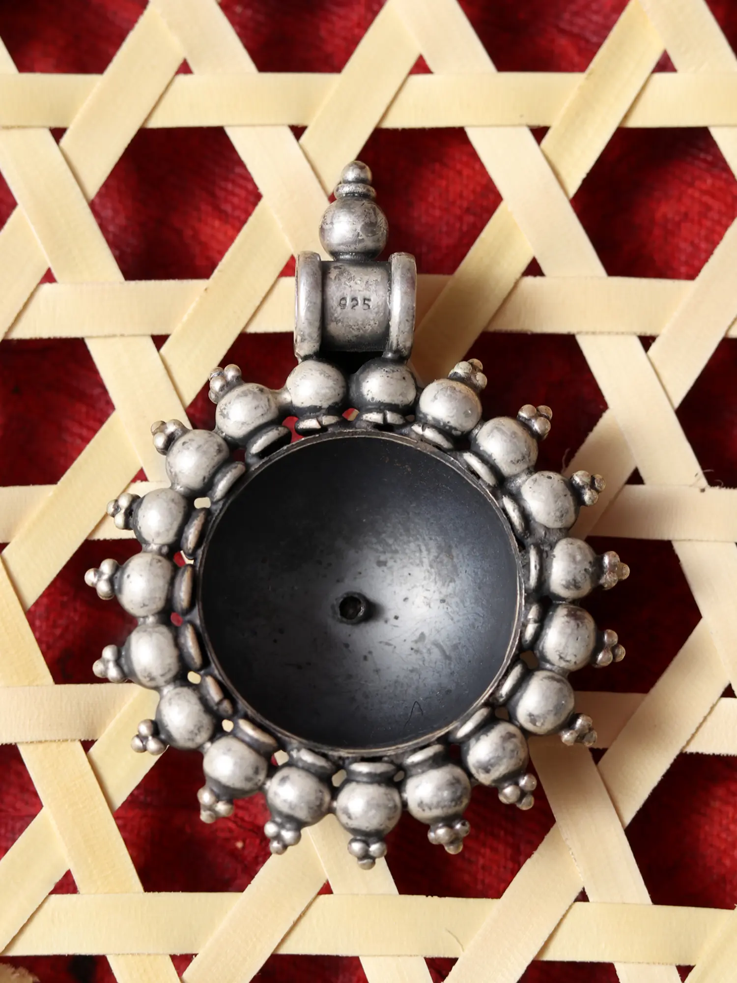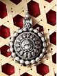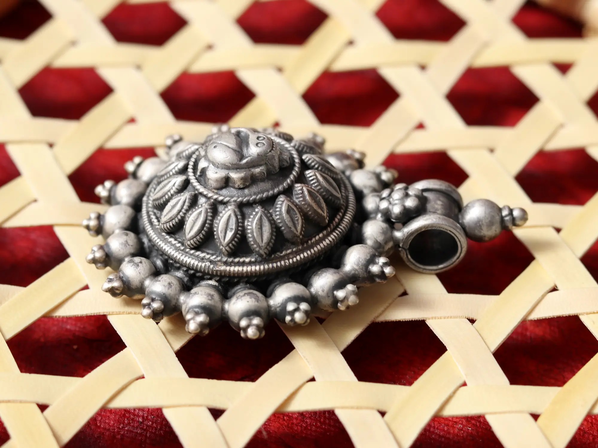 Measuring a distinguished 2.3 inches in height and 1.8 inches in width, this pendant commands attention without being ostentatious. The central motif, radiating outward with a series of textured beads and stylized leaves, creates a captivating sunburst effect. This substantial yet elegant form makes it a versatile piece, designed to be admired from every angle.