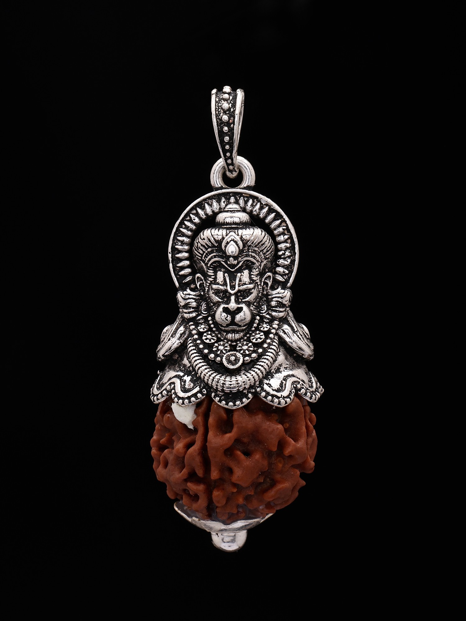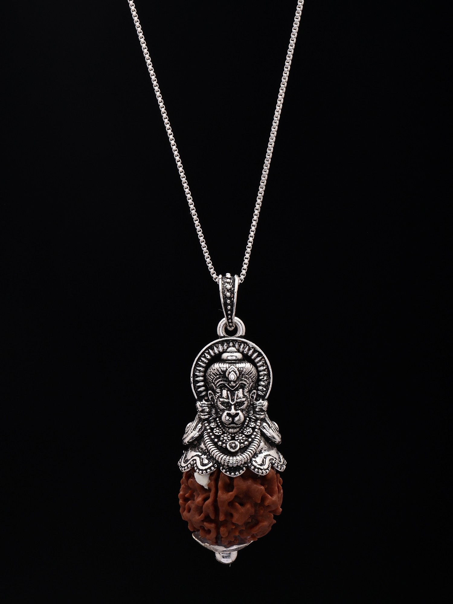 Complementing the divine representation of Lord Hanuman is a genuine, certified Panchmukhi Rudraksha. This sacred seed, with its five natural faces, is revered for its spiritual properties and is believed to represent the five faces of Lord Shiva, bestowing blessings of peace, good health, and prosperity upon its wearer. The natural texture and earthy tones of the Rudraksha create a striking contrast with the polished silver, adding a layer of natural beauty and profound spiritual significance to the pendant. This unique combination makes the pendant not just a piece of jewelry, but a spiritual talisman.