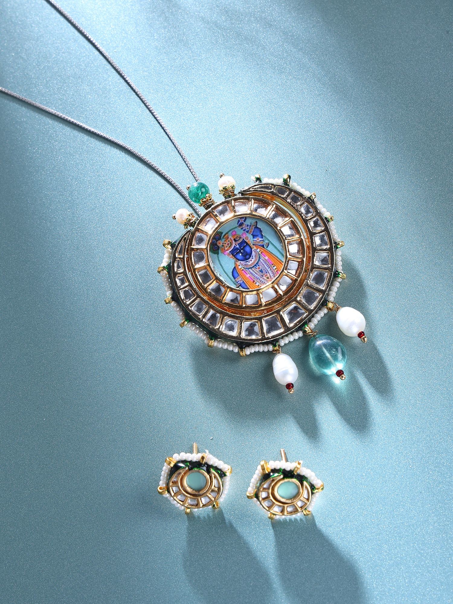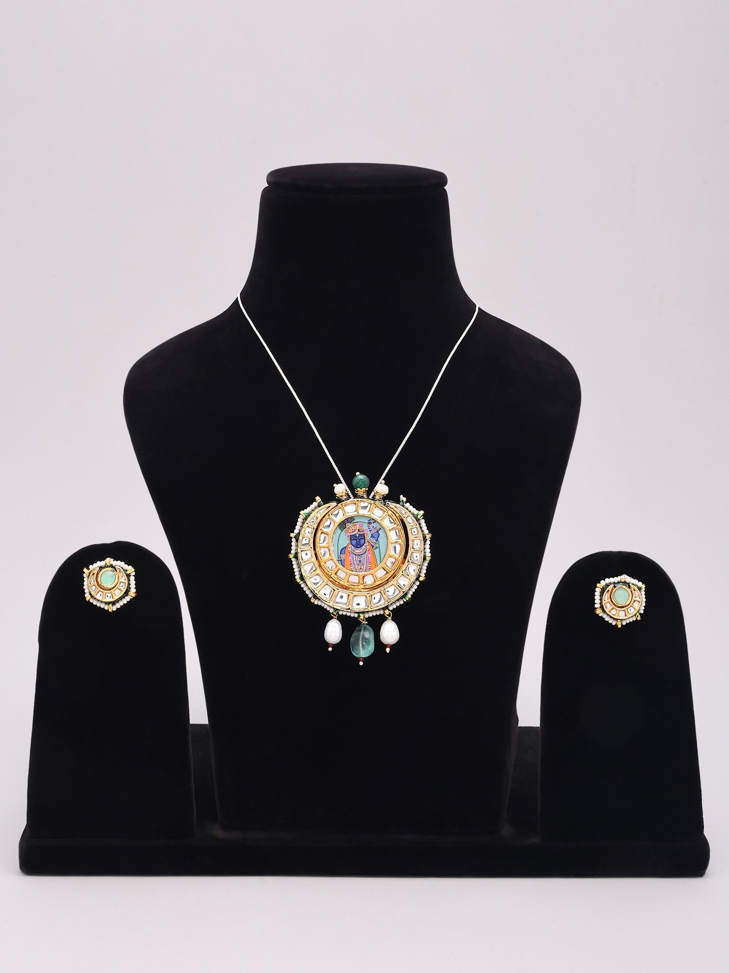 Stone and Kundan Studded Lord Krishna Pendant Set with Earrings