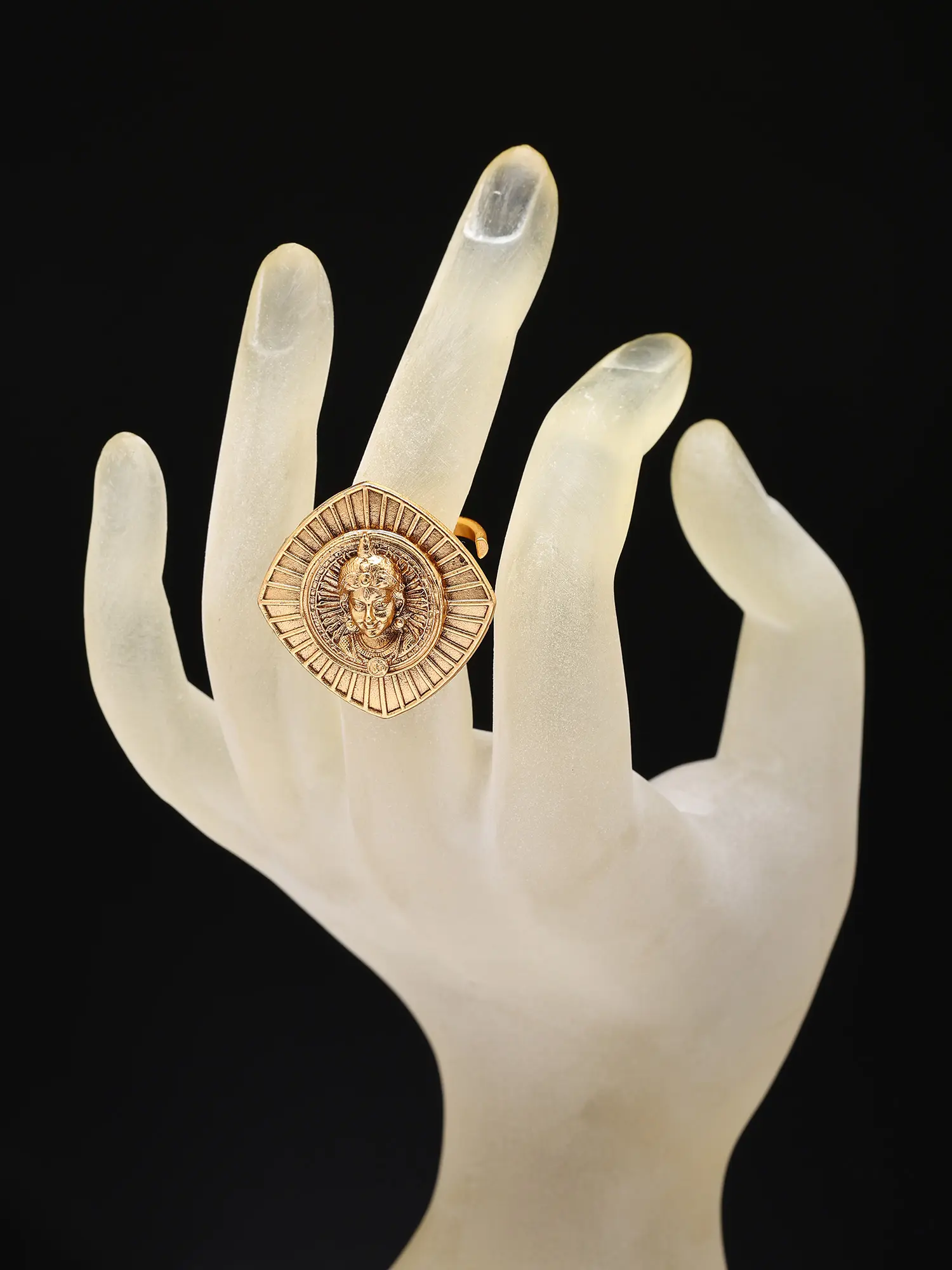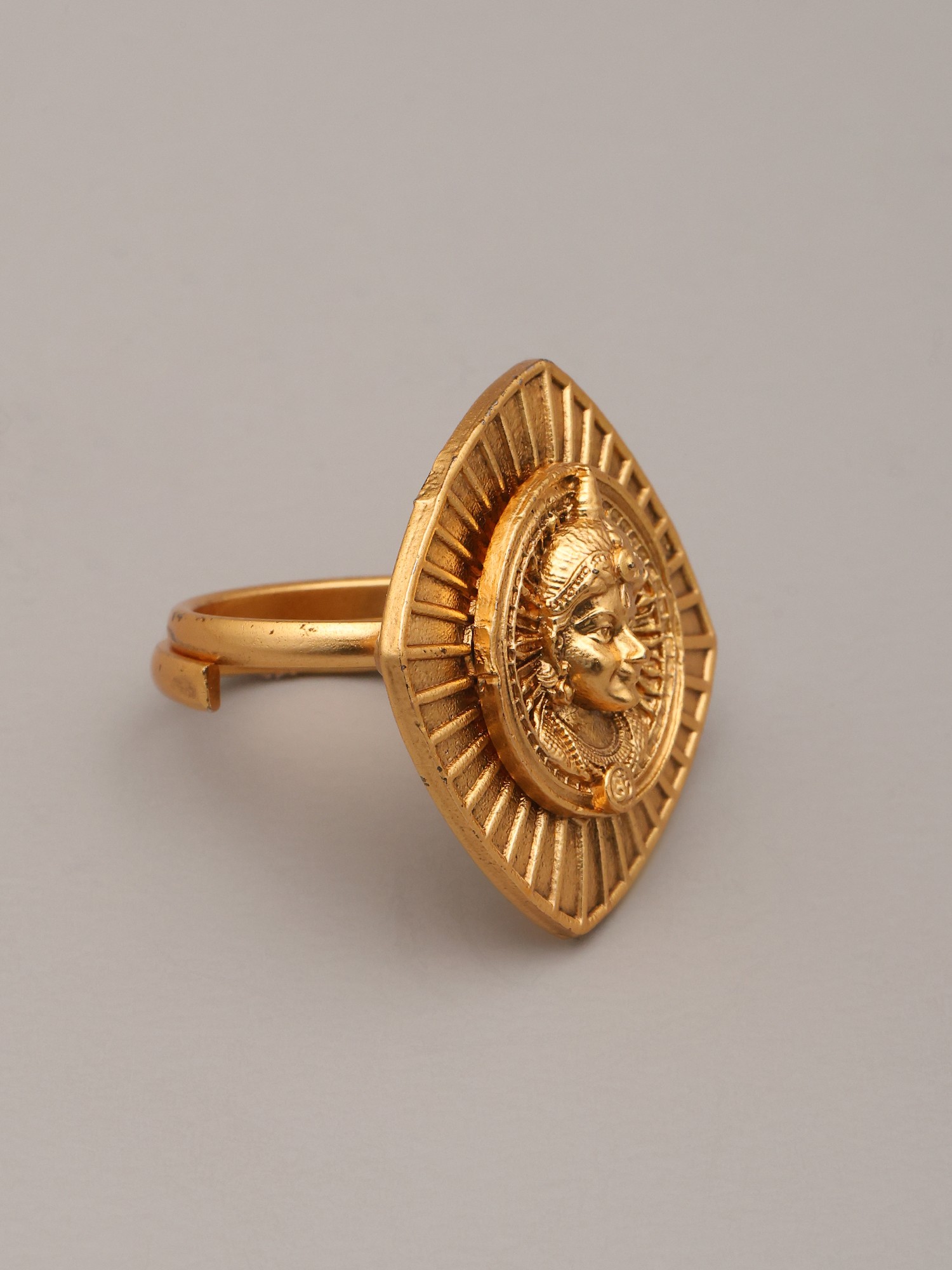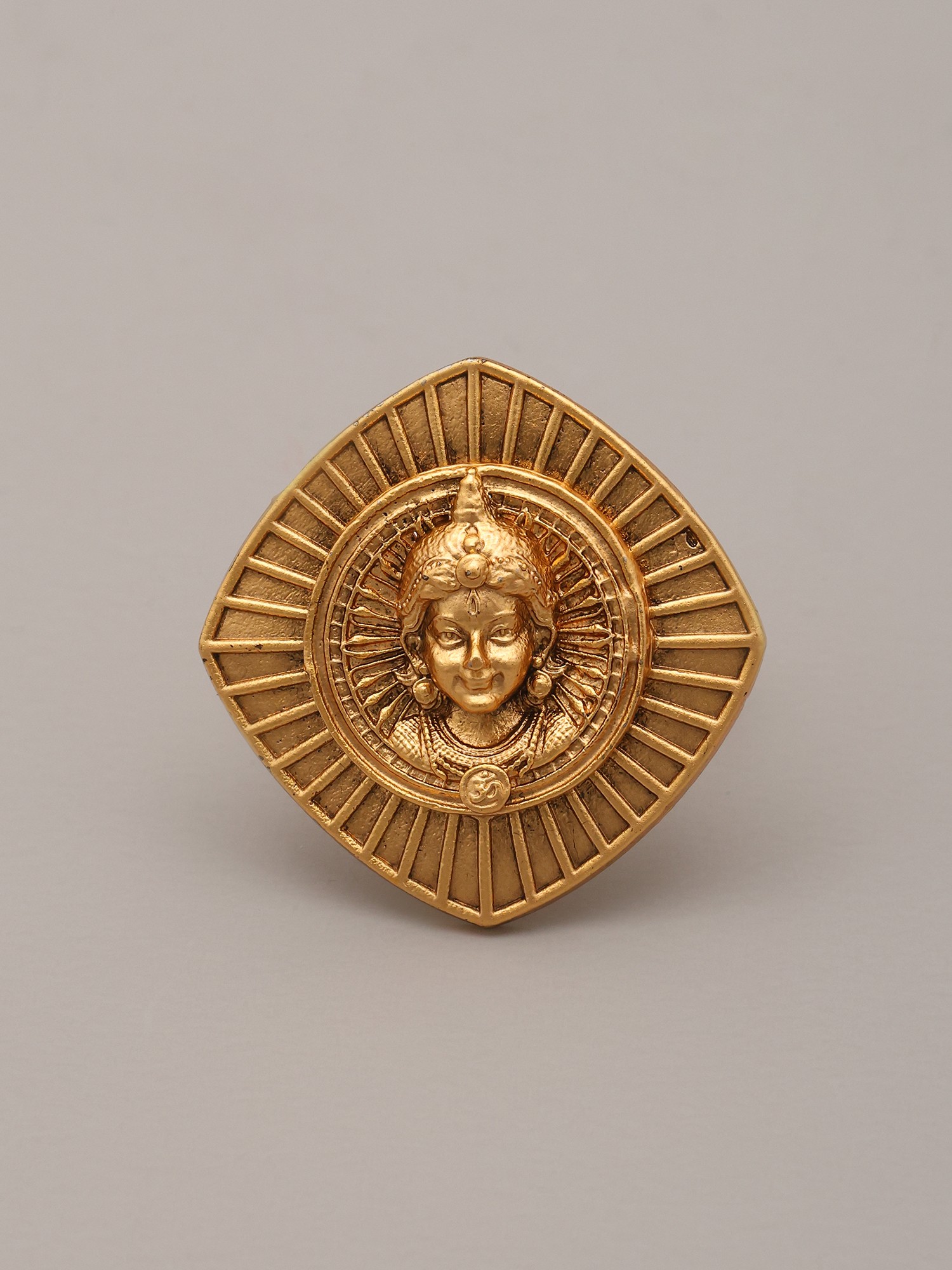 This ring is crafted from brass, a material celebrated for its durability and warm, golden hue. The brass adds an element of timelessness, invoking a sense of tradition and cultural richness. The golden finish brings out the intricate details of the carving, giving it depth and dimension. Whether worn as a daily reminder of faith or reserved for special occasions, this ring promises to be a cherished heirloom for generations to come.