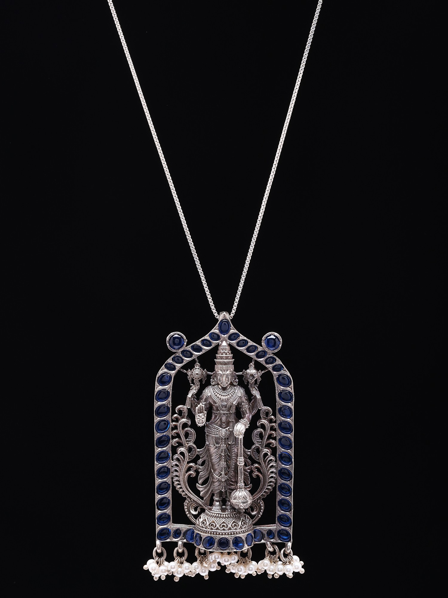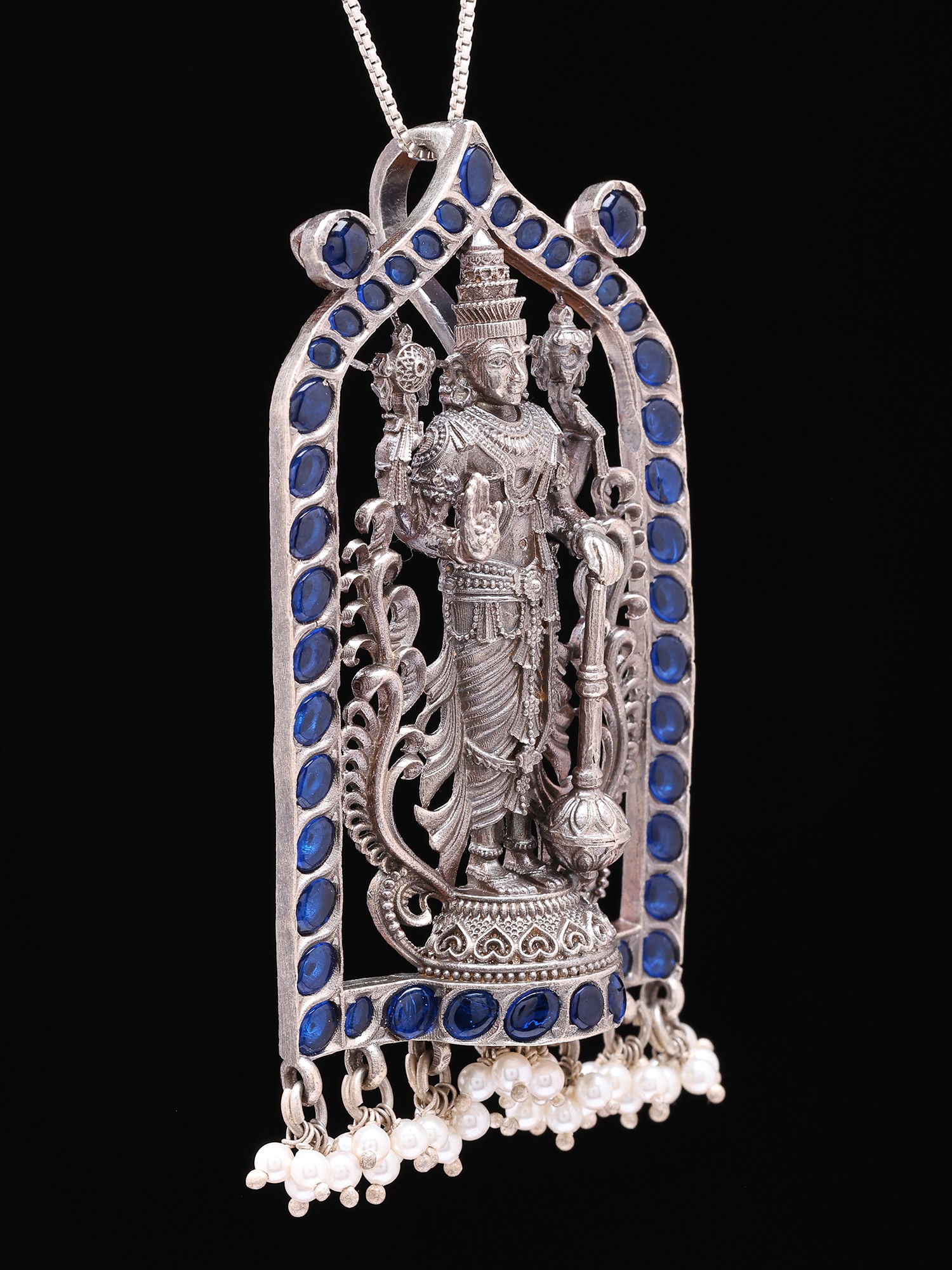 Lord Vishnu Oxidised Silver Temple Pendant with Pearl Drops