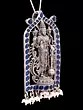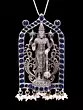 The central depiction of the deity stands tall, rendered with remarkable precision and depth within its protective frame. This frame, a symphony of curving lines, is adorned with a border of vibrant, deep blue stones that draw the eye and complement the silver's subtle sheen. Cascading pearl drops along the lower edge add a touch of delicate femininity and movement, catching the light with every subtle shift. Measuring approximately 2.5 inches in height and 1.3 inches in width, it offers a prominent yet balanced presence, a testament to thoughtful design.