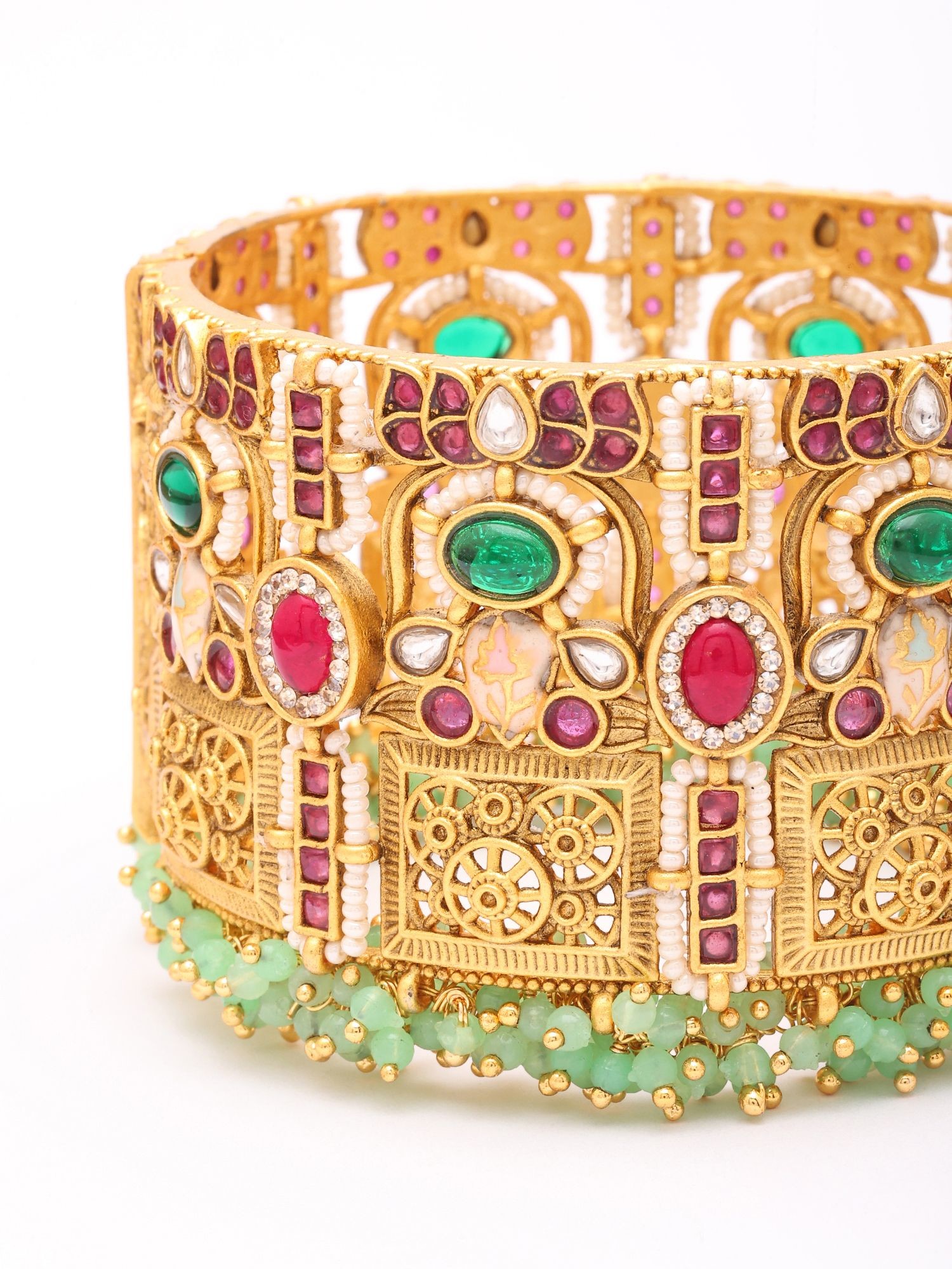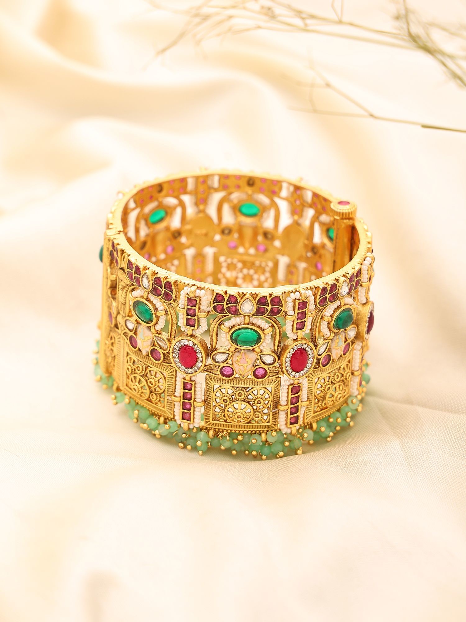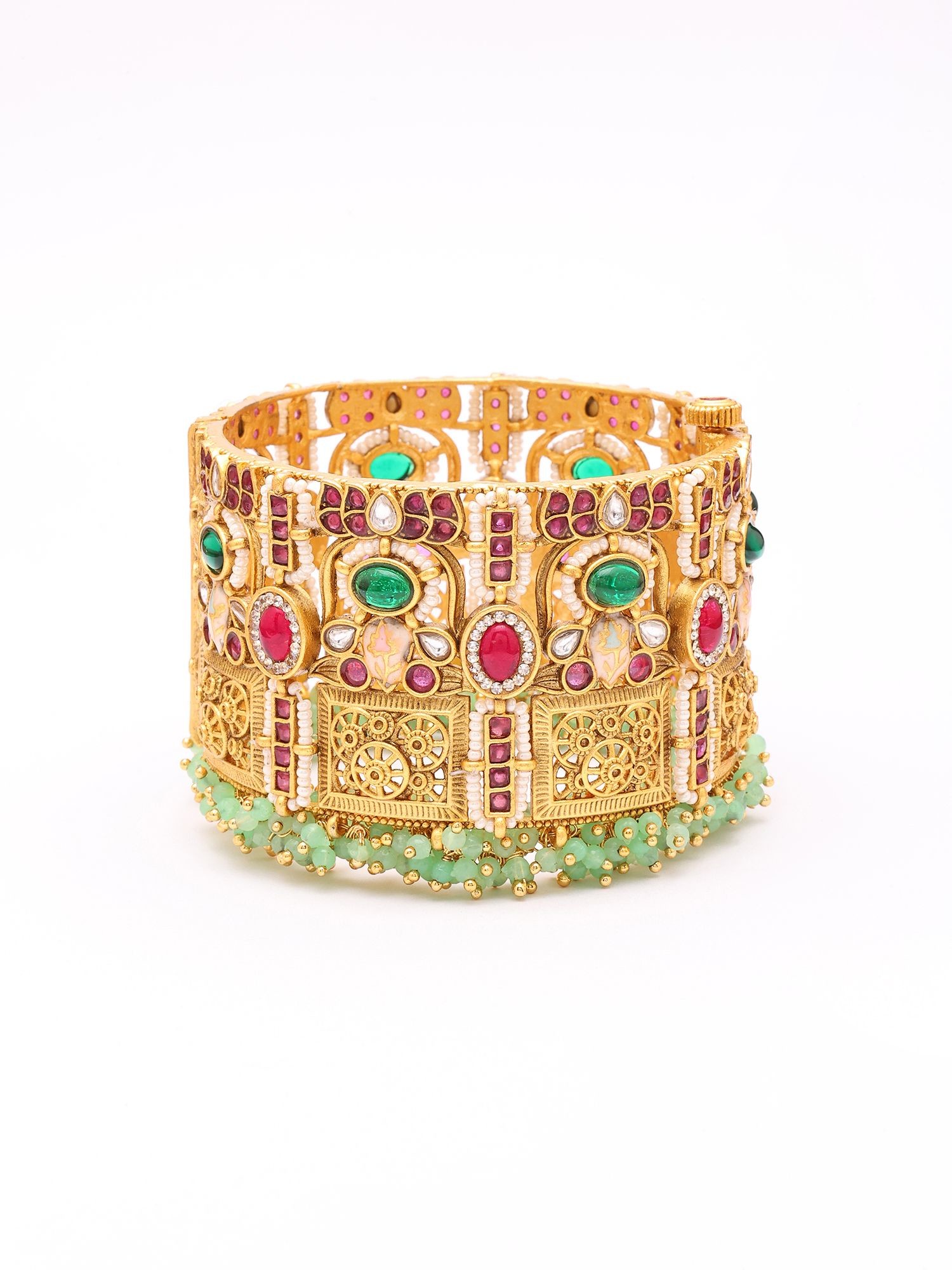 Lotus Floral Kundan Openable Bridal Bangle with Green Bead Drops