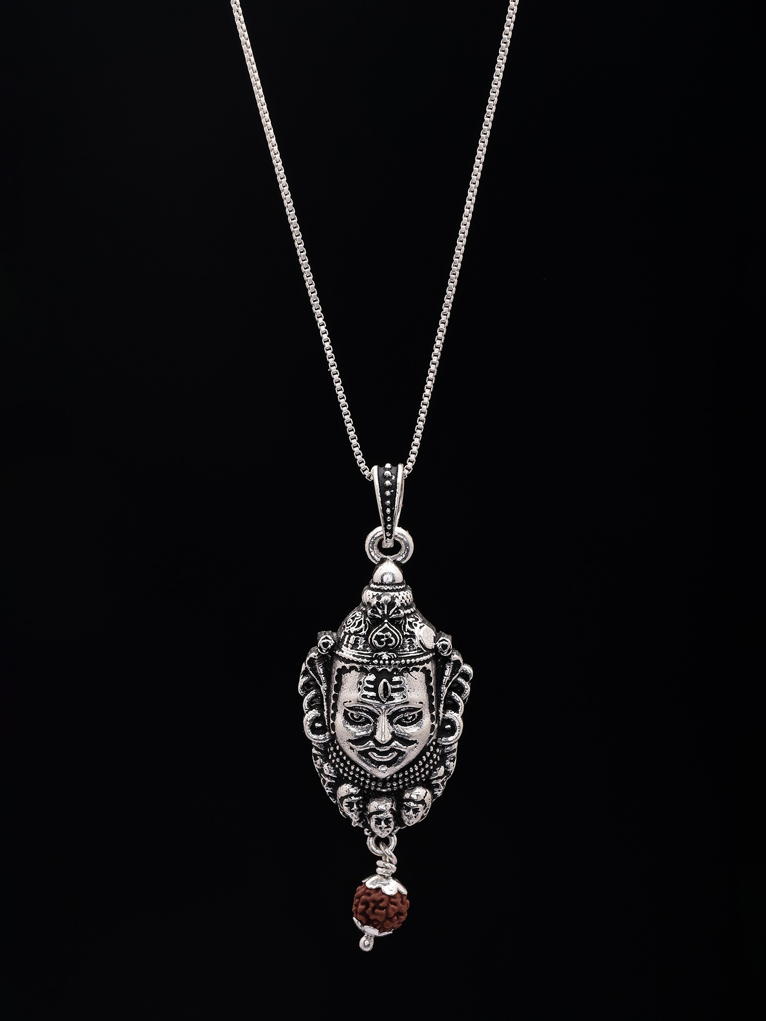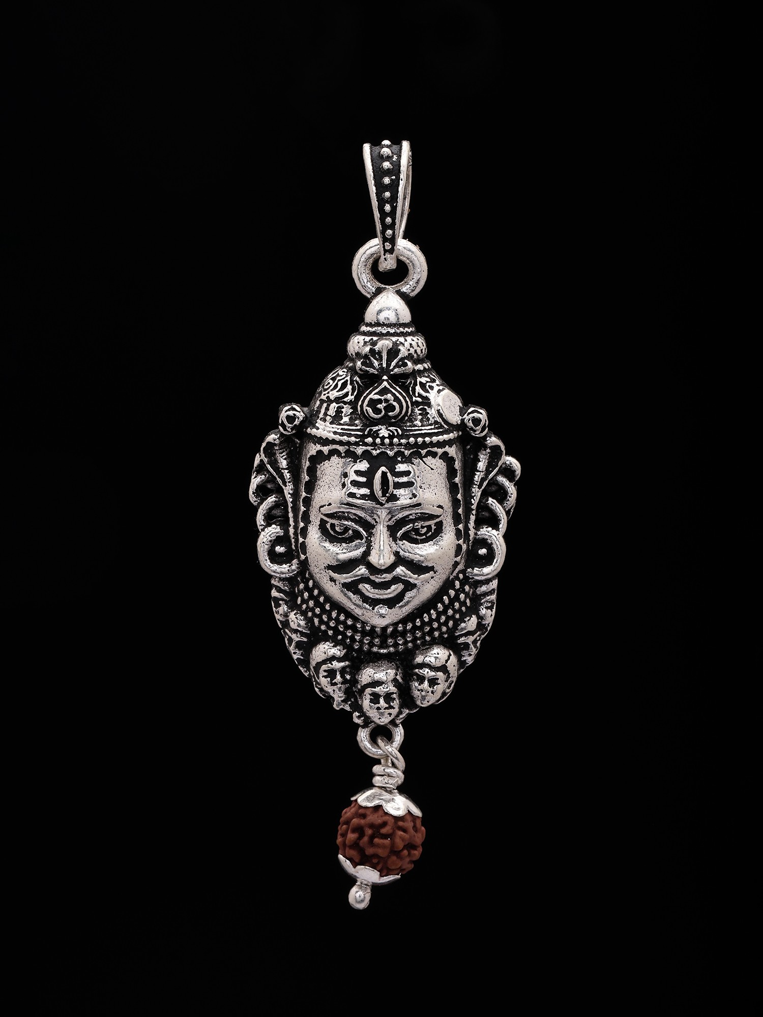 Adorn yourself with an emblem of spiritual significance and timeless craftsmanship. This exquisite sterling silver pendant captures the powerful visage of Mahakal, a formidable aspect of Lord Shiva, symbolizing transformation, destruction of ego, and the ultimate reality. Expertly sculpted with intricate detail, the pendant showcases the serene yet intense gaze of the deity, framed by traditional ornamentation that speaks of ancient artistry. The fine lines etched into the silver create a depth and character that draws the eye, while the polished finish reflects light beautifully, making it a statement piece for any occasion.