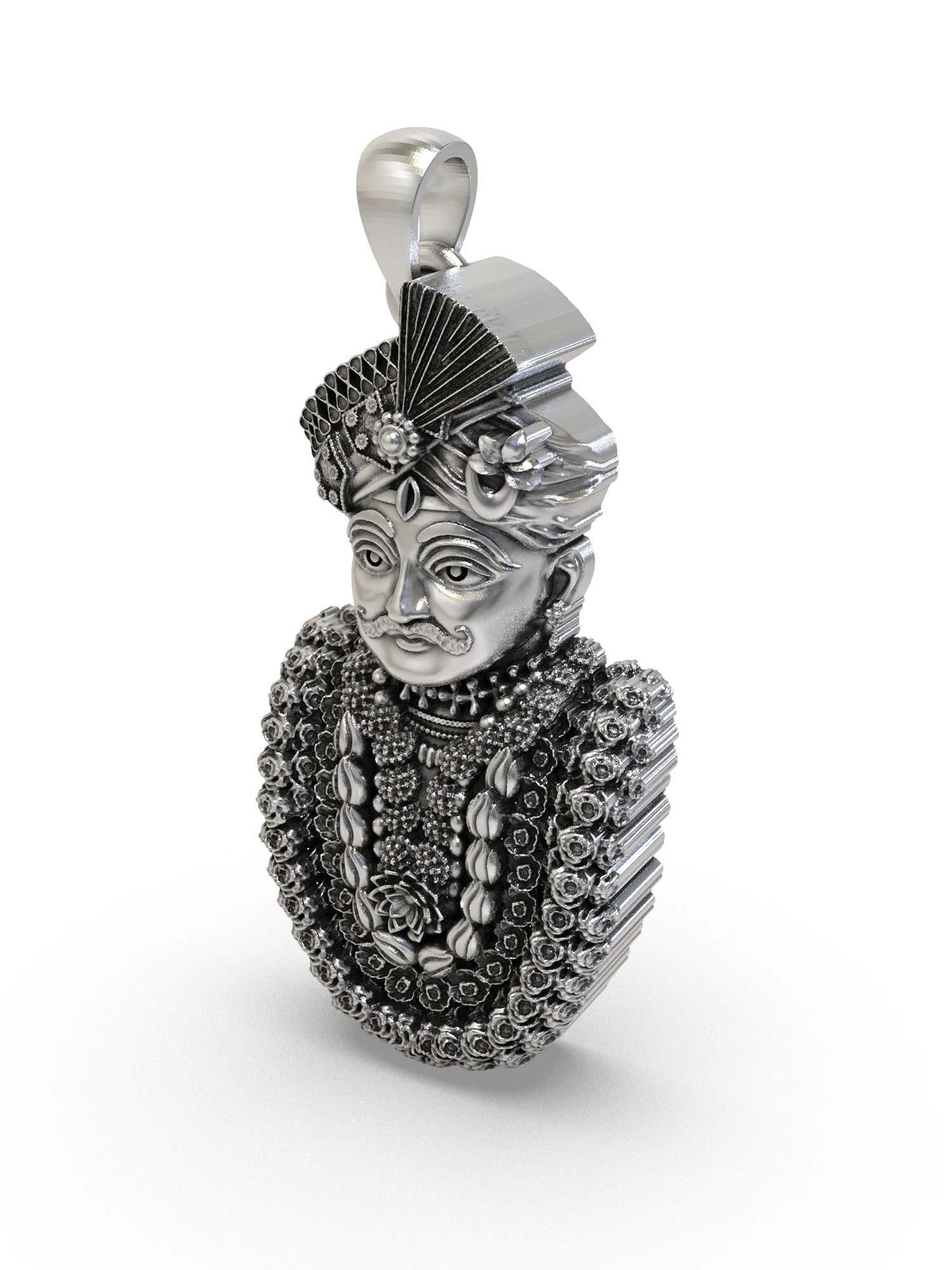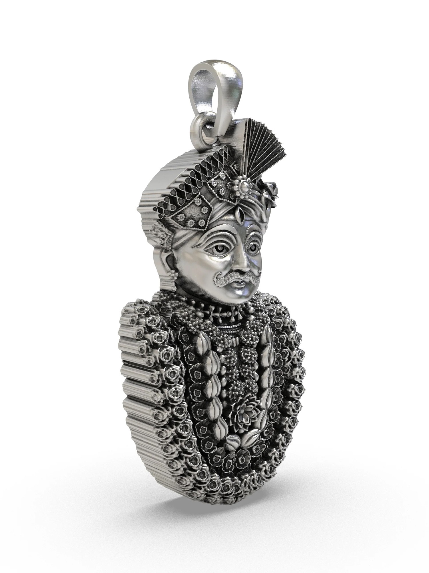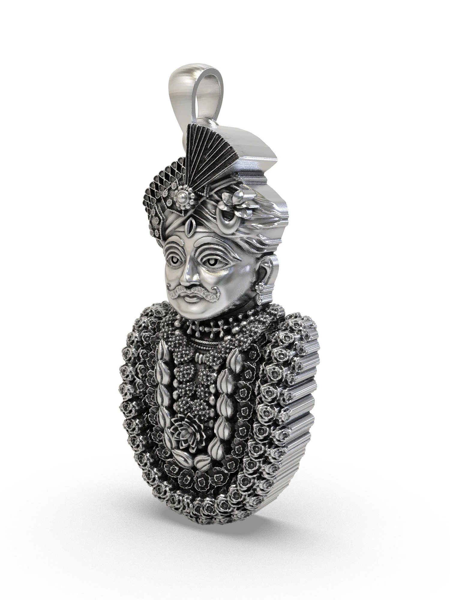 Standing at approximately 1.15 inches in height, this piece commands attention with its rich textural tapestry. The intricately carved turban, adorned with a traditional fan, showcases remarkable precision. You’ll appreciate the layered garlands, rendered with a multitude of miniature blossoms and decorative motifs, creating a visual depth that is truly captivating. The subtle gleam of polished silver highlights every contour, inviting you to explore its captivating form.